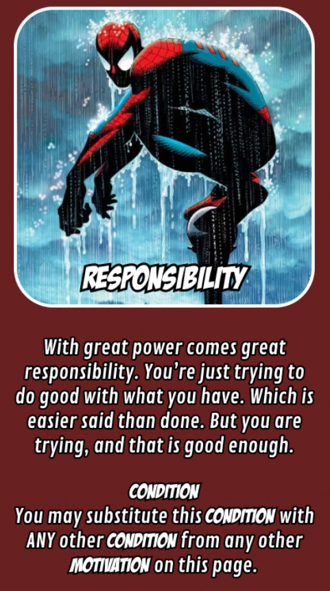 >>97330940I'm brainlet and confused by this, can you explain it real slow? I took Self-Serving and Adrenaline so if I took Responsibility does it basically negate the normal conditions of one of my other 2 choices?