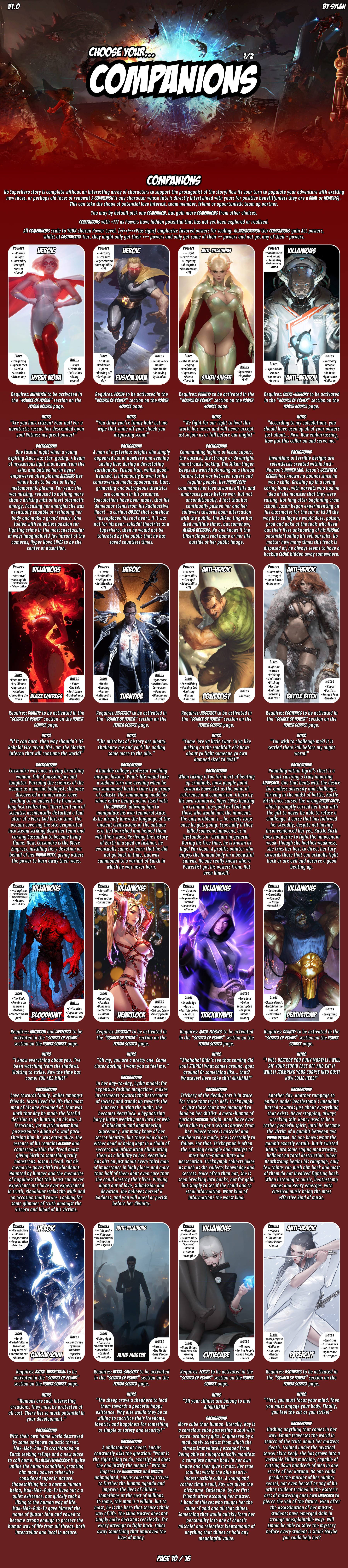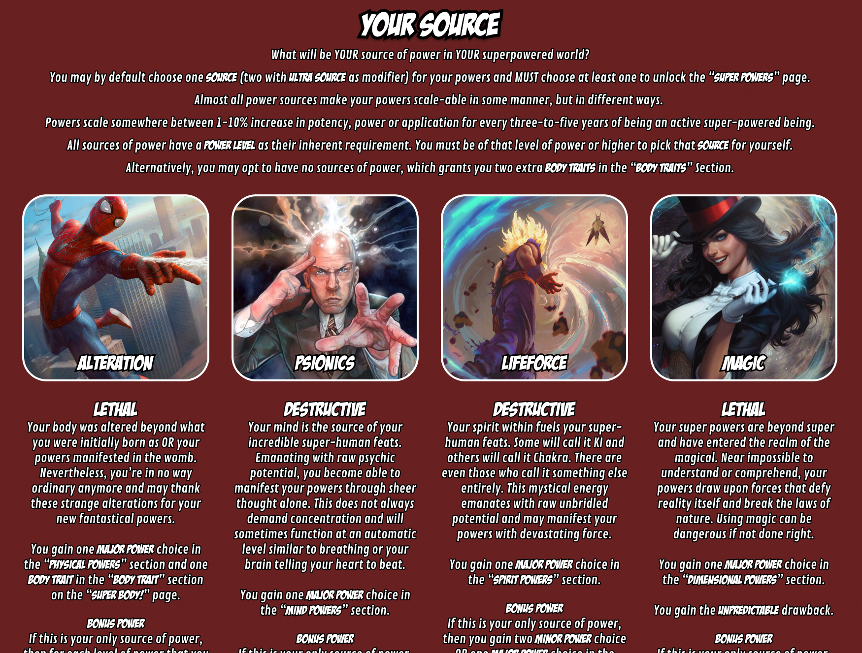 >>97339463>Perspective: Heroic [+1 Benefit, +1 Body Trait]>Super Goals: Guardian [+1 Benefit]Conversion [+1 Pos. Canon Event]Legend [+1 Pos. Canon Event]>Motivations: Good-Hearted [+1 Minor Power]Justice [+1 Minor Power]Responsibility (Adrenaline) [+1 Major Power, +1 Benefit]>Power Level: Armageddon [+1 Super Power, +2 Major Powers]>Power Level Modifiers:One Level Above [+1 Super Power, +3 Drawbacks]Super World (x3) [+3 Benefits]>Danger Level: Bleak [+1 Major Power, +3 Benefits]>Danger Modifiers:Murder Hobos [+1 Major Power]Plot ProtectionSuperhero Antics>Sources Of Power: All>Your Source(s): Genetics [+3 Minor Powers, +1 Body Trait]Universal [+1 Major Power, +1 Super Power, +2 Drawbacks]>Source Modifiers:Cosmic Earth (Drawback)Greater Exchange [-2 Minor Powers, +1 Major Power]Ultra Source [-1 Benefit]>The Stage Of The Present:Timestamp: Stable (Pos.)Governance: Continental (Pos.)History & Climate: Historical/Climate Catasthrophe (Neutral)Jurassic (Neg.)Golden Protector (Pos.)The Long Peace (Pos.)Connected (Pos.)End Bringer (Neg.)Survival Of The Fittest (Neg.)Cradle Of Power/Terran Sanctity/Celestial Heart (Free)Shadow Government (Neg.)Secret Facilities (Neg.)Shadow Supers (Neg.)The A-Team (Pos.)Academy Of Supers (Pos.)Corporate Rule (Neg.)Alternate Dimensions: All>Threats:Thugs (Common)Professional Theives (Common)Ferals (Common)Saurus (Common)Mongrels (Common)Mutant Flora (Common)Cryptids (Common)Crazed Scientists (Common)Failed Experiments (Rare)Mutant Freaks (Rare)Ancient Weapons (Rare)>Super School:Training Room [-1 Minor Power, +1 Major Power]Data Collection (Drawback)Experimentation (Drawback)Hidden Facility (Drawback)Teen Romance [+1 Comapanion]>Super Corporation:Scarlet BiologicsHero StreamerCreation Program (Drawback)Blackmailed (Drawback)Big Corp Asset (Drawback)