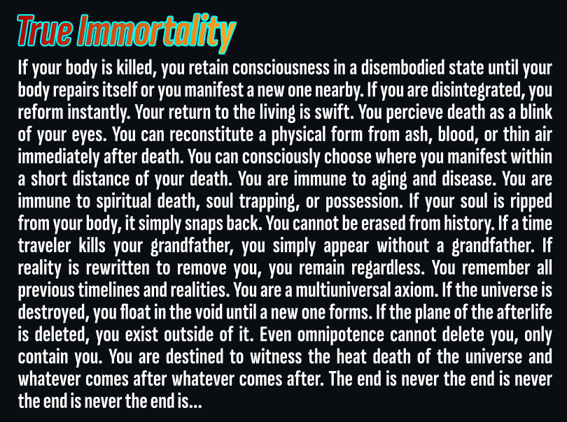>>97340216>"Immortal Soul" is a solid B-tier immortality option that grants you true immortality, but if slain you respawn, taking longer to return. If you continually die the respawn timer extends up to a millennia.Fix'd my bad grammar, apologies gentlemen.