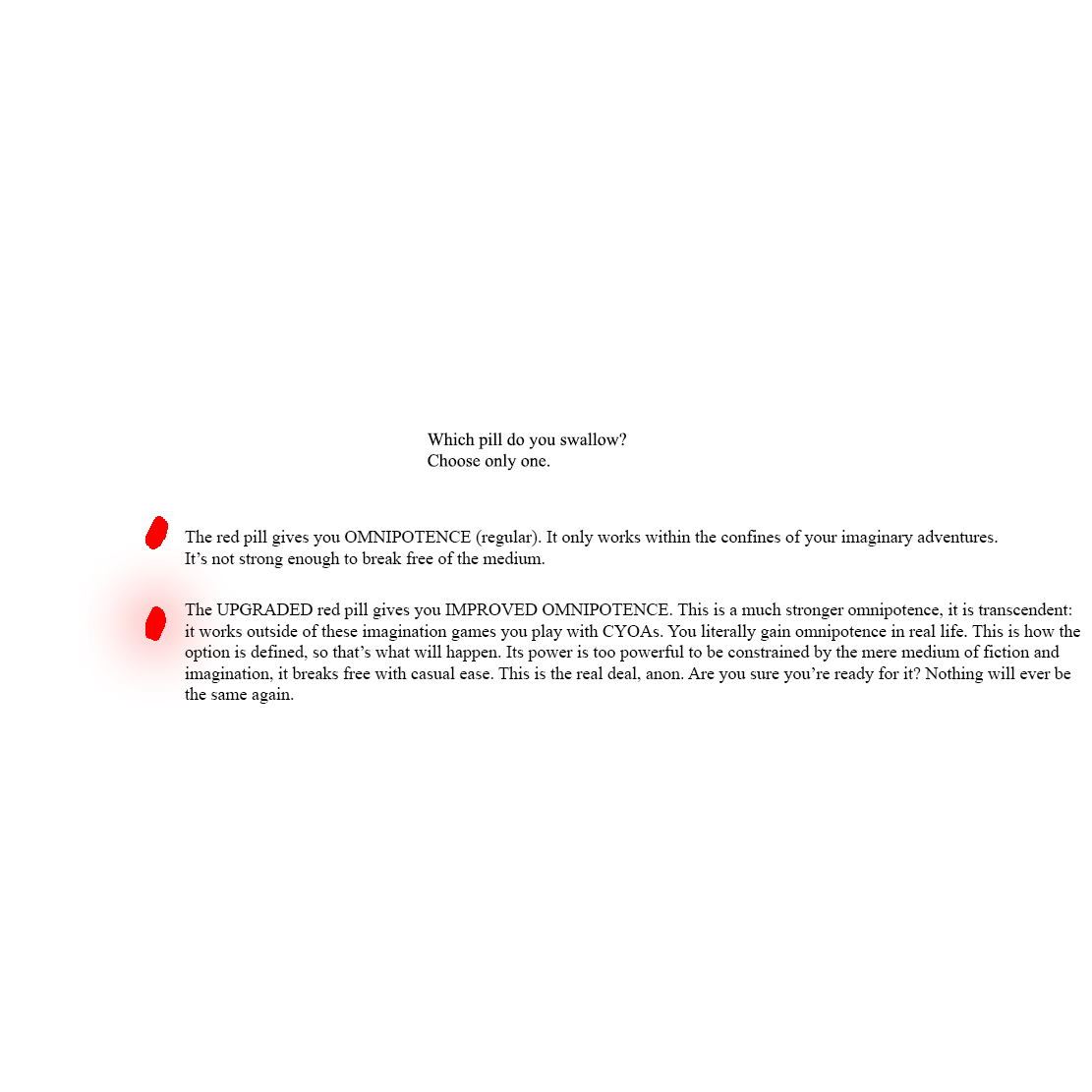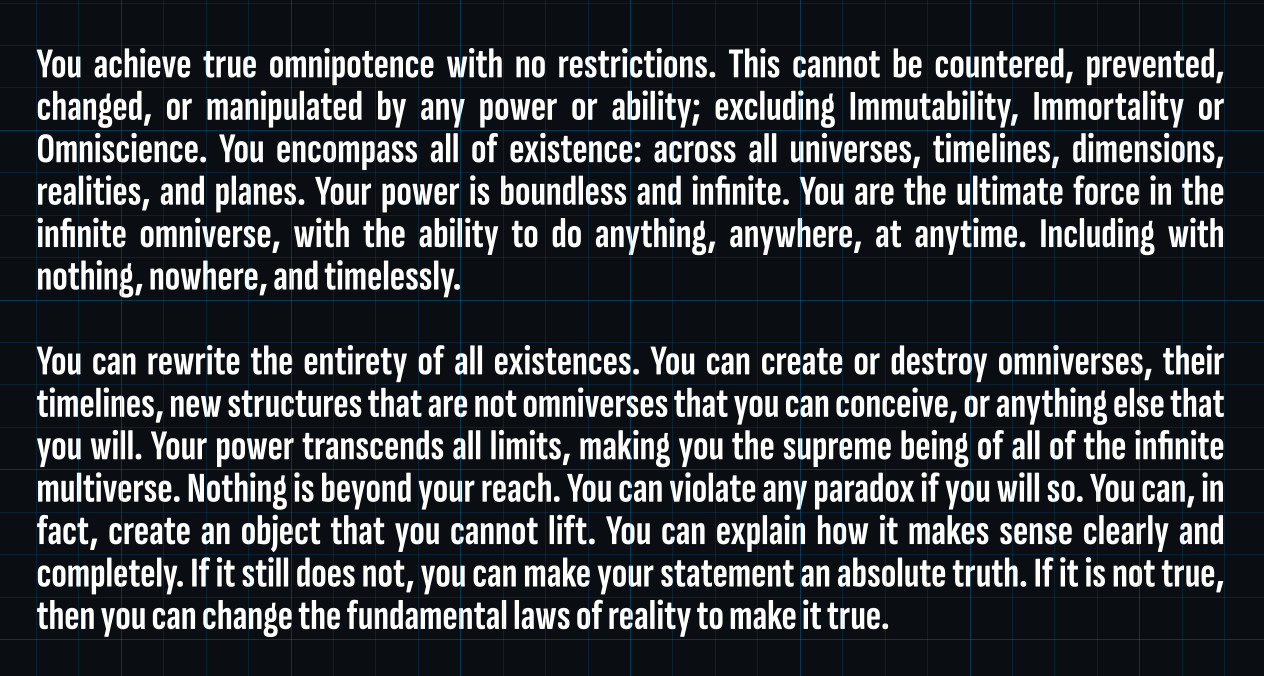 >>97340481To clarify, this reads to me like OMNIPOTENCE (regular) from >>97340522 . That is, I don't literally become omnipotent in real life just by reading your cyoa. That's pretty weak and limited
