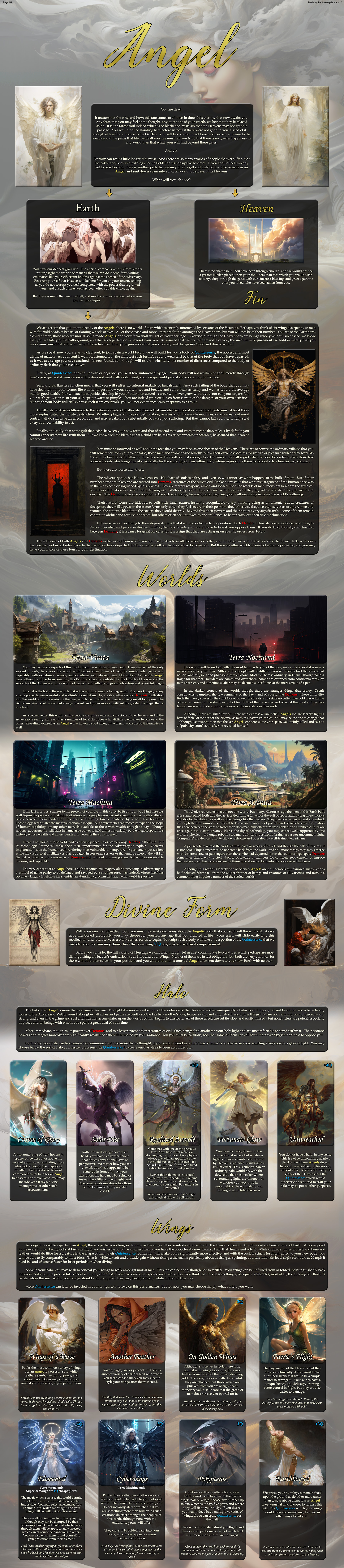 >>97339640>Super Powers:Strength (Major/Genetics)Durability (Super/Genetics)Senses (Major/Genetics)Speed (Major/Genetics)Flight (Major/Genetics)Natural Weapons (Minor/Genetics)Adaptability (Hyper/Genetics)X-Ray Vision (Minor/Universal)Plasma-Vision (Major/Universal) [+1 Minor Power]Creativity (Major/Universal)Willpower (Super/Universal) [+1 Drawback]Chaos (Major/Universal) [+2 Drawbacks]>Super Body: Alien Physiology [+2 Body Traits]>Body Traits:LongevityIdeal MetabolismGenius (Major/Universal)Handsome [+1 Companion]Cut Like MarbleAcid BloodVenomous BiteSelected FertilityCommanding Voice>Benefits:Filthy Rich [Free]Back To School [Free]In Business BabyBeacon Of HopeMartial ArtistEscape ArtistPlane CarrierIndestructibleMerge (Chaos/Plasma-Vision)>Drawbacks:UnpredictableMaterial WeaknessRival>Canon Events:Training Arc [Free]Power Up [Free]Unlock Potential (Pos.) [-1 Benefit]Noble Lineage (Pos.)Imprisoned (Neg.)From Space! (Neg.)>Companions:PapercutDawnstarMagnet BoyTried to make a Superman-expy, as heroic as possible despite darkness. A little choked by Corporate Rule, but otherwise a pretty exciting kitchen-sink world, there’s everything from extraterrestrial droids to otherworldly demons. Despite an Alien Physiology, bodyplan is still indistinguishable from a human’s, aside from when Natural Weapons are deployed. My “Chaos-Vision” bypasses Chaos’s innate drawbacks by just merging it with my Plasma-Vision in an uncontrolled stream of destructive energy instead of trying to control it directly. Plasma feels close enough to a primordial state of matter anyway. Aside from the Material Weakness, pretty much practically immortal for all intents and purposes. Obviously pretty screwed by being a Big Corp Asset, but that’s a problem to solved in due time. Companions weren’t all that interesting, unfortunately, but there’s a whole community of the last of my race(?) to spend time with/get help from too.