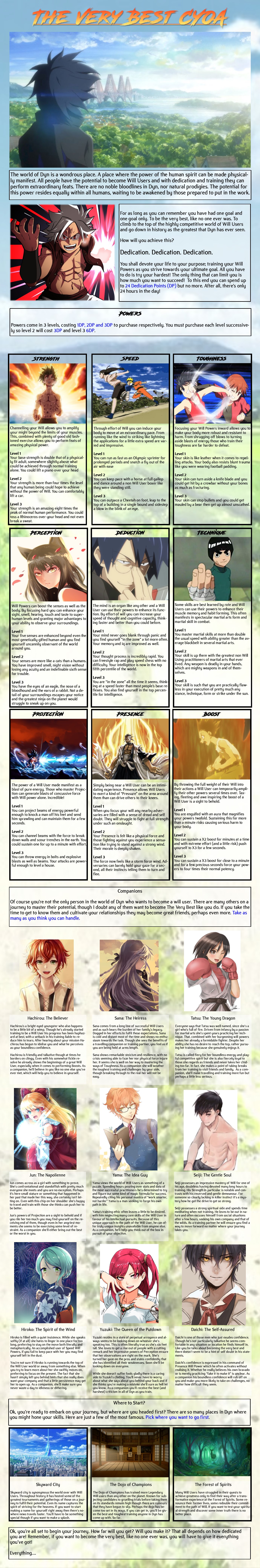 >>97343589>Canon EventsPositive: Training Arc, Power Up! x2, Last Stand, Quest for Power (Major Projection), Family and Friends (Family + Pet Friends)Negative: Grand Failure, From Space! + Abducted, Defeated By Trash (Mongrels), Power Bleed>The MultiverseShielded>CompanionsSuper-Powered Family and Pet FriendsThis is a world that is constantly beset by endless hordes of darkness, yet hope still stands despite everything. Mankind was almost brought to the brink of annihilation during an alien invasion over 200 years ago, but the sudden rise of super powered beings changed everything. They rallied the scattered broken remains of earth's militaries, and drove back the invaders when teams of supers infiltrated their vessels and blew them back to hell with nuclear fire. Many made the ultimate sacrifice that day, those that survived where hailed as living legends, their brave actions in liberating the planet to never be forgotten. Together, humans and the few empowered remaining, rebuilt society greater than ever before, all of humanity unified under one banner, vowed to never let infighting and division endanger their homeworld from outside threats ever again, and so the United Terran Republic was born. Centuries later, Merrick stands as the newest addition in a long line mass produced super soldiers genetically bred to defend the planet until their dying breath. Like many others of his kind, Merrick has never knew his real parents, and was instead born and raised in a government facility, but this place wasn't unkind like you'd expect. Instead of being treated like machines, the empowered children were treated with care and respect, taught the virtues of justice, duty, and the common good that all citizens should aspire to. They were not just soldiers sent out to kill without thought, they were heroes ingrained with the responsibility to serve mankind as honorable guardians, and walked openly among the people of their world.
