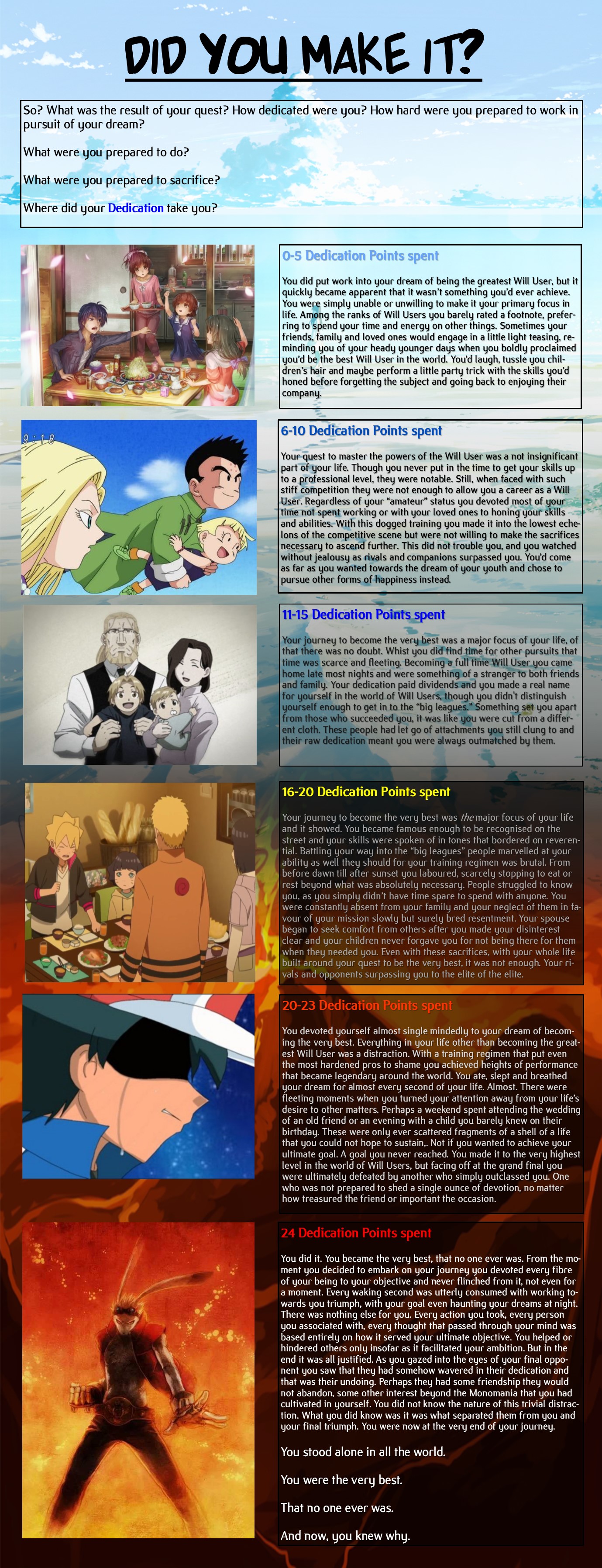 >>97339463>PERSPECTIVE: anti herowhat is darkness without light? what is destruction without creation? what is madness without sanity? for the void to continue existing so must the world keep spinning, and any villain who attempts to destroy its balance must in turn be destroyed.>GOAL: knowledgethe scraps of eldritch knowledge I gained so far are nothing compared to what else can be learned if one can survive sinking deeper into the crushing depths of madness.>MOTIVATION: self servingthere is no need to bother myself with mortal desires such as justice or wealth, nor do I need to elevate the ignorant masses, after all they would only slow me down.>POWER: armageddon>MOD: one level abovemy power originated from outside this world, it is only natural it would be outside its normal scale.>DANGER: dark>MODS: plot protection + guardian angel>SOURCES: all>MY SOURCE: universal (eldritch)>MODS: minor exchangeIt was just a single glimpse but it was more than enough to shatter my past self.I can't help but wonder if maybe just as that meeting changed my existence maybe in some way I changed it too.>STAGE: stable, continental, ahistorical, calm biosphere, radioactive zones, jurassic, golden protector, super soldiers, alien invasion, victorious, endbringers, unremarkable earth, super rehabilitation, super school>DIMENSIONS: celestia, demonia, fyros, distonia>COMMON THREATS: thugs, professional, thieves, ferals, sickos, mongrels, cryptids, hired crews, crazed scientists>RARE THREATS: rogue magi, mutant freaks, ancient weaponsthe world is a dangerous place, but necessity is the mother of innovation, so these obstacles meant to stop me will only push me further towards the knowledge I seek.