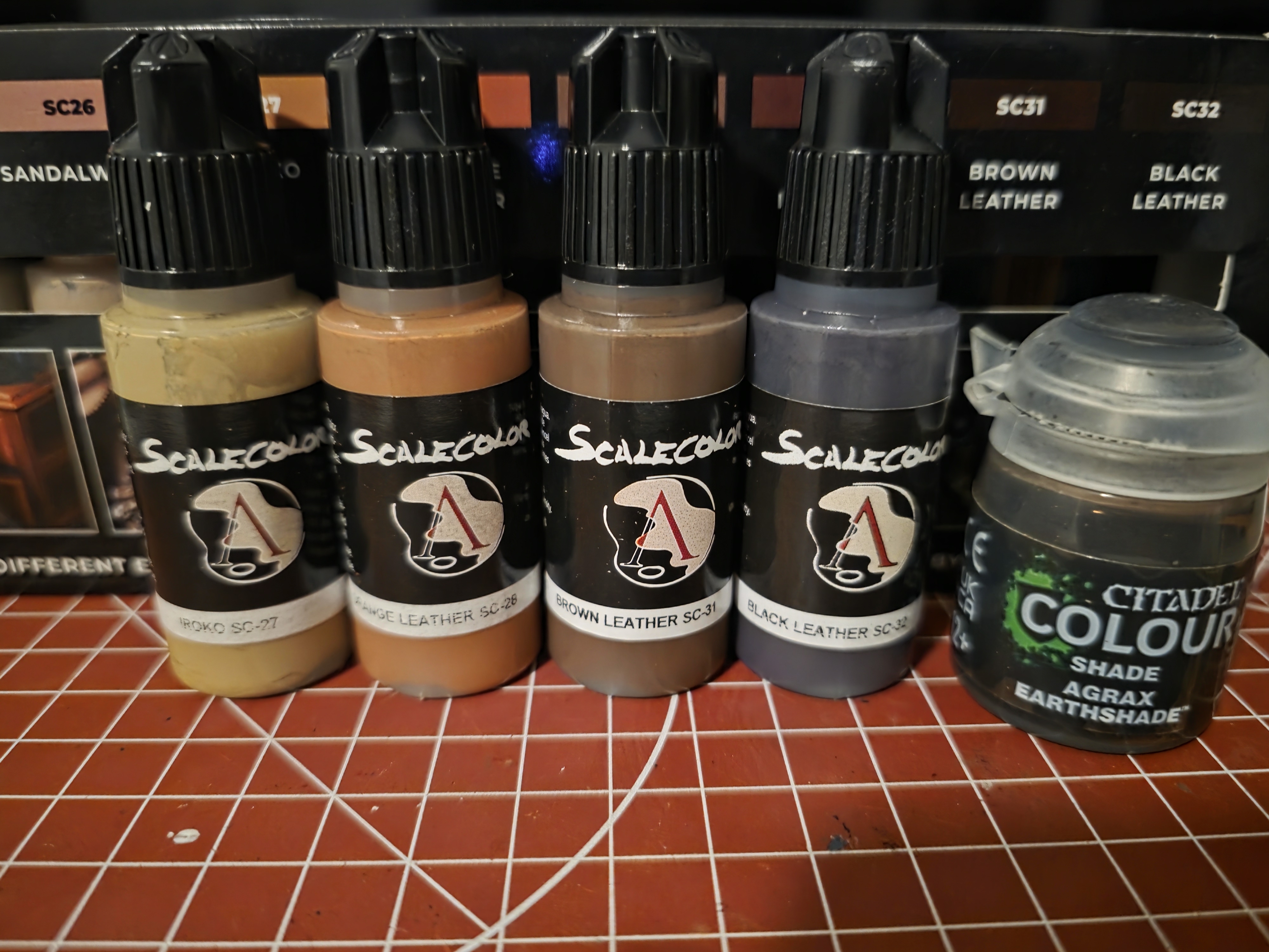 >>97343703Basecoat with SC31, paint shadows and recesses with SC32, then creases and raised areas with SC28 and SC27 for the very top/edges that catch the most light. Then when it dries thinned agrax earthshade all over to blend.The set is called wood and leather from scalecolor