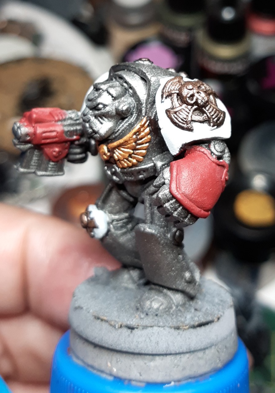 Finally getting around to those terminators of mine, couldn't sleep so I started on some base coats. Desk lamp is a bit harsh for photos, but the crux and the chest eagle are done, those are always fast and easy to do. The fist will have a checkerboard pattern over the red, will be using some transfers for that, though, I don't trust myself to hand paint that on such a small surface. And I swear the grey over-layer is just drinking up the dark metal(citadel iron warriors) like a drunk at the bar, it'll probably be a better finish after a wash, but it still feels kinda annoying.