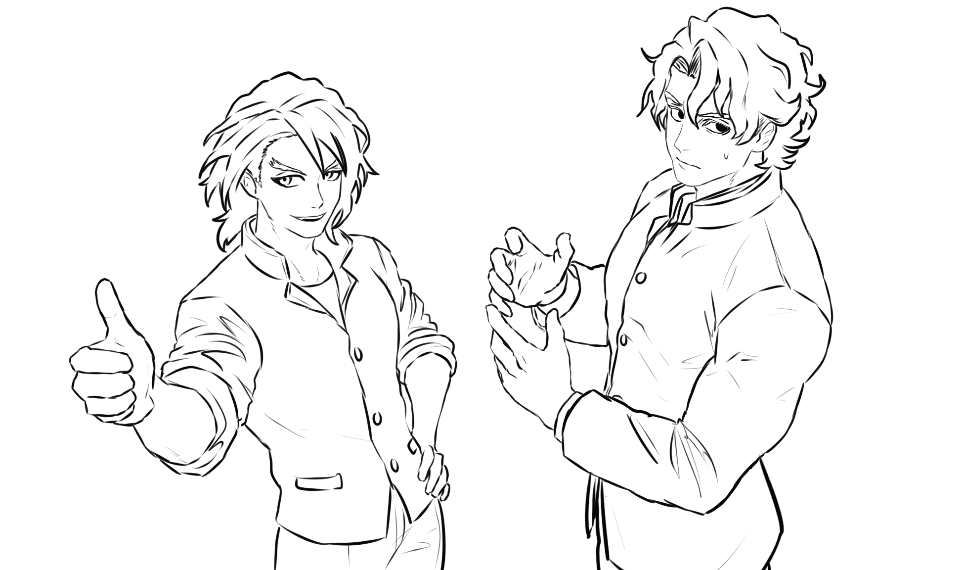 >>97343699Holy FUARK!!! This is peak fiction, Shuanon. It's curious that you drew both of them with fairly curly hair, I tend to draw Takaishi a little curly because I try to spice up the faceclaims of some characters if I find them a little bland when I draw them but it's funny because I was thinking Kaoru might start wearing her hair a little differently after the last part of her arc to try and stand out more, maybe with Madoka's advice. It's quite peak to see their dynamic presented like this. I've been trying to improve my own art lately so you're always an inspiration my dude>>97343738I'd chalk that up to me drawing Takaishi's hair a little curlier than the ref is, and a little game of telephone ending up with Shuanon drawing Takaishi like how I draw Takaishi, but also if this was coloured I think it would be clear that it's not Shu. Also they wear different clothes and Takaishi is clearly bigger than Shu>>97343751STAY BACK, SATAN!!!