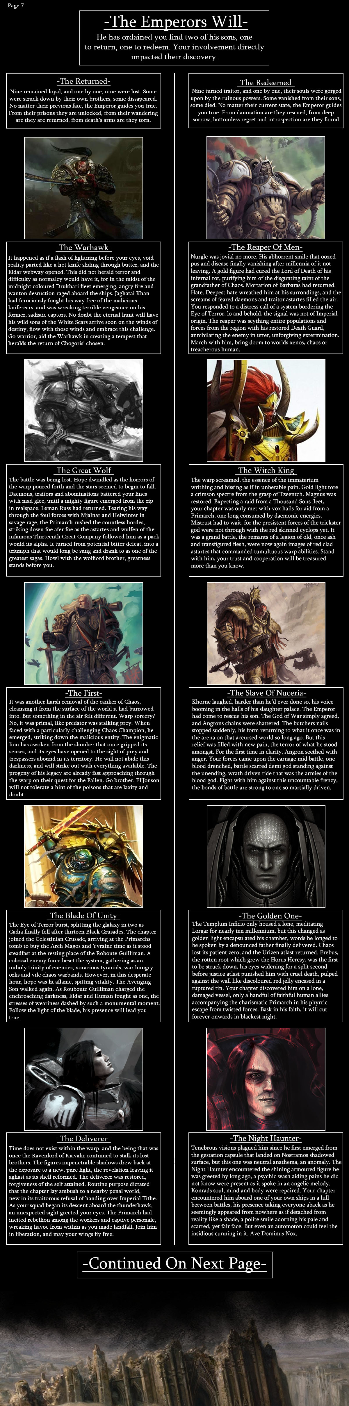 >>97346919>Void Born>-Kin of the Abyss>Emperor's Spears>-Something to Prove>Techmarine>Mark V, Heresy Pattern>Servo Harness>Bolt Pistol>Bolter>Last of the Veil*>The Gorgon>The Golden One>Company Champion>My Brothers, My Bond