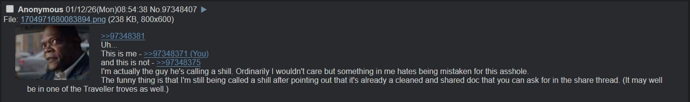 >>97348381Uh...This is me - >>97348371and this is not - >>97348375I'm actually the guy he's calling a shill. Ordinarily I wouldn't care but something in me hates being mistaken for this asshole.The funny thing is that I'm still being called a shill after pointing out that it's already a cleaned and shared doc that you can ask for in the share thread. (It may well be in one of the Traveller troves as well.)
