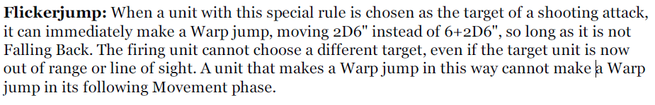 >>97352949My first exposure to it was taking a bunch of flamers because i was used to my friends mantle of the laughing god Autarch>>97353054Flicker jump was fucked and wasn't capped in the shooting phase.