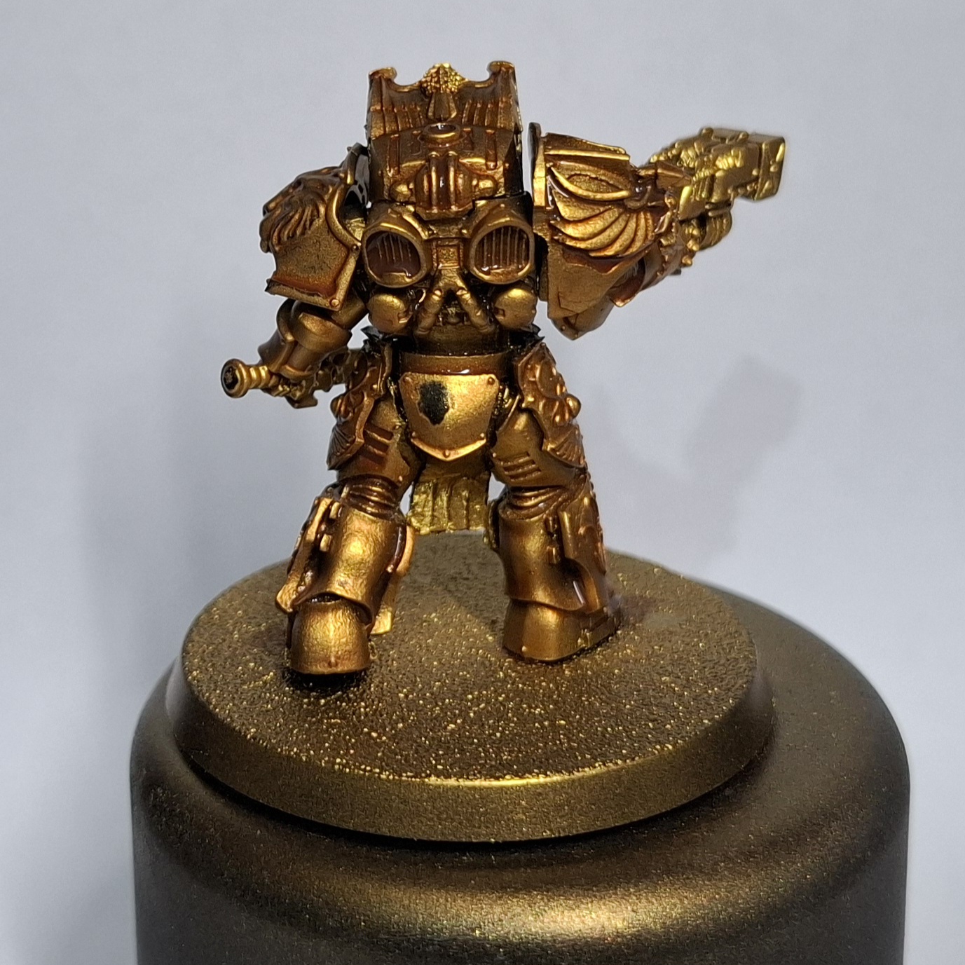 >>97353544>>97353555Vallejo gloss black airbrush primer through an airbrush (duh) which takes a good few hours to dryBasecoat was Liquitex bright gold ink also airbrushed. The gold seems to reactivate and rub off really easily with a wet brushWell at least I know it'll be easy to be strip