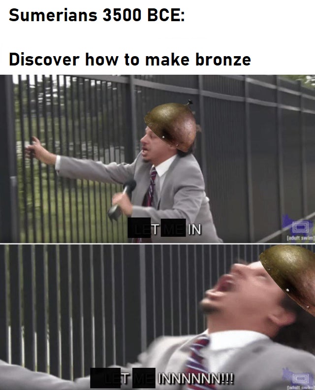> be Bronze Age Hero> The Gods gift me weapons and armor>they're all steel > ayylmao