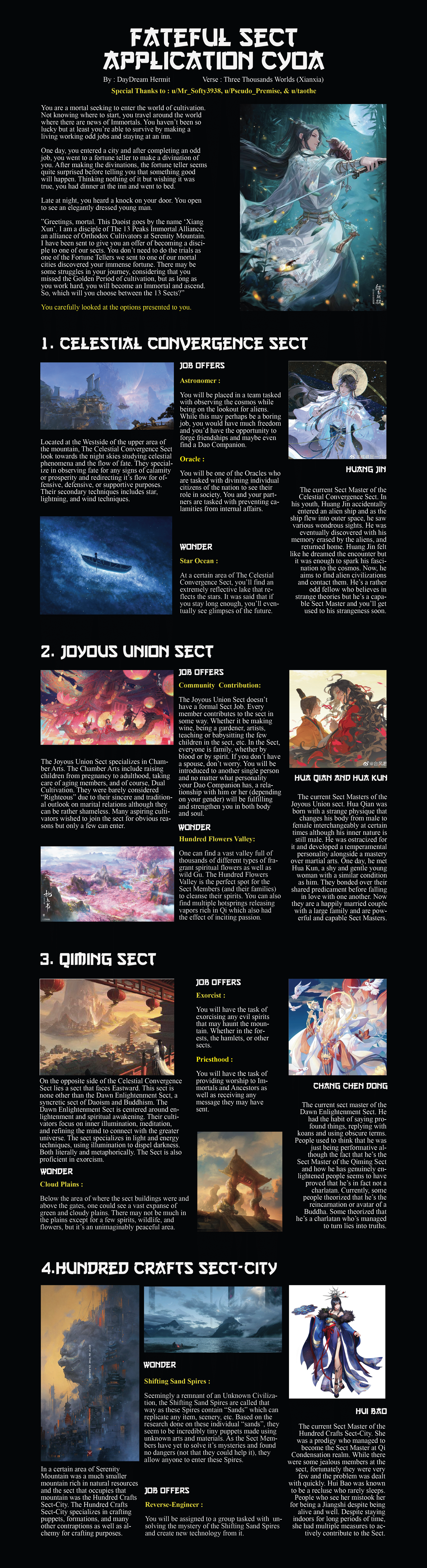 >>97363030> SectSiliang Island (Autumn)The power of time travel cannot be understated.> JobHistory Manipulation ObserverI'll take the one that lets me stay at home for the most part.> ItemsStrange CupWooden FishPainting of a SageTo help accelerate my cultivation and ensure I become immortal.