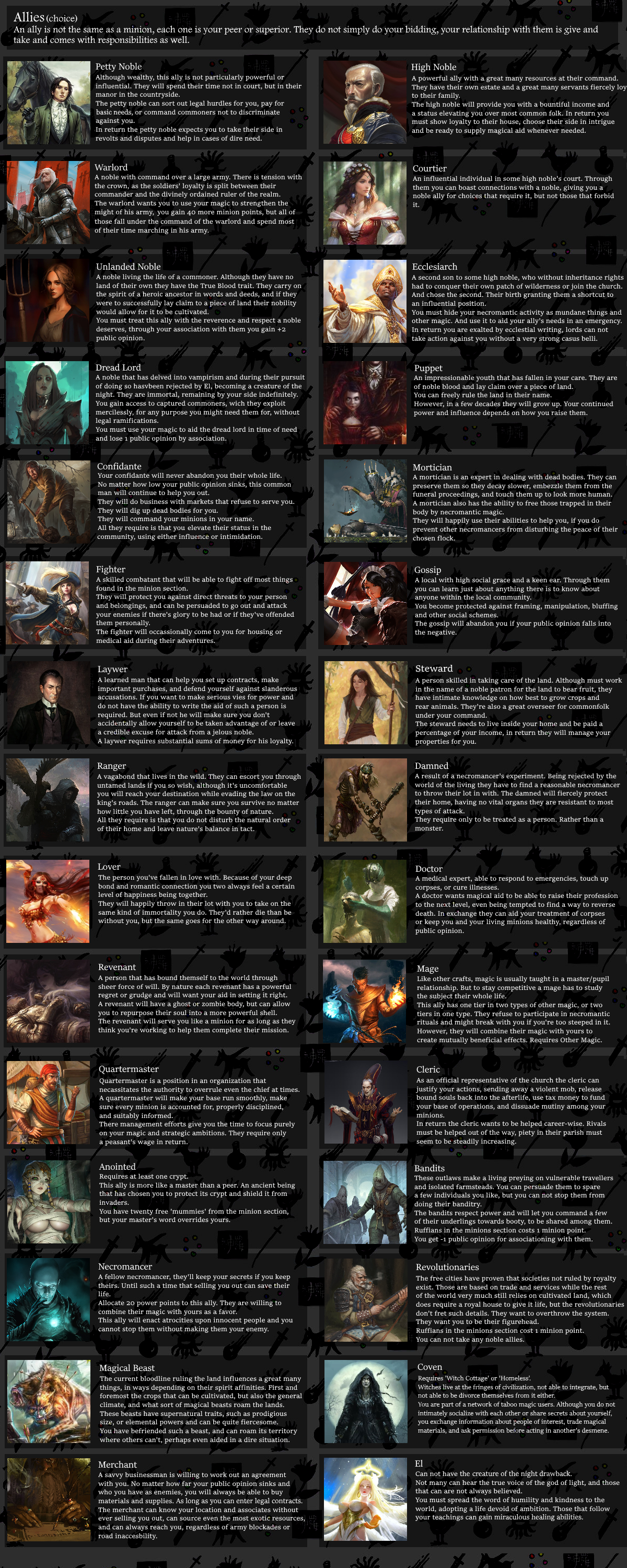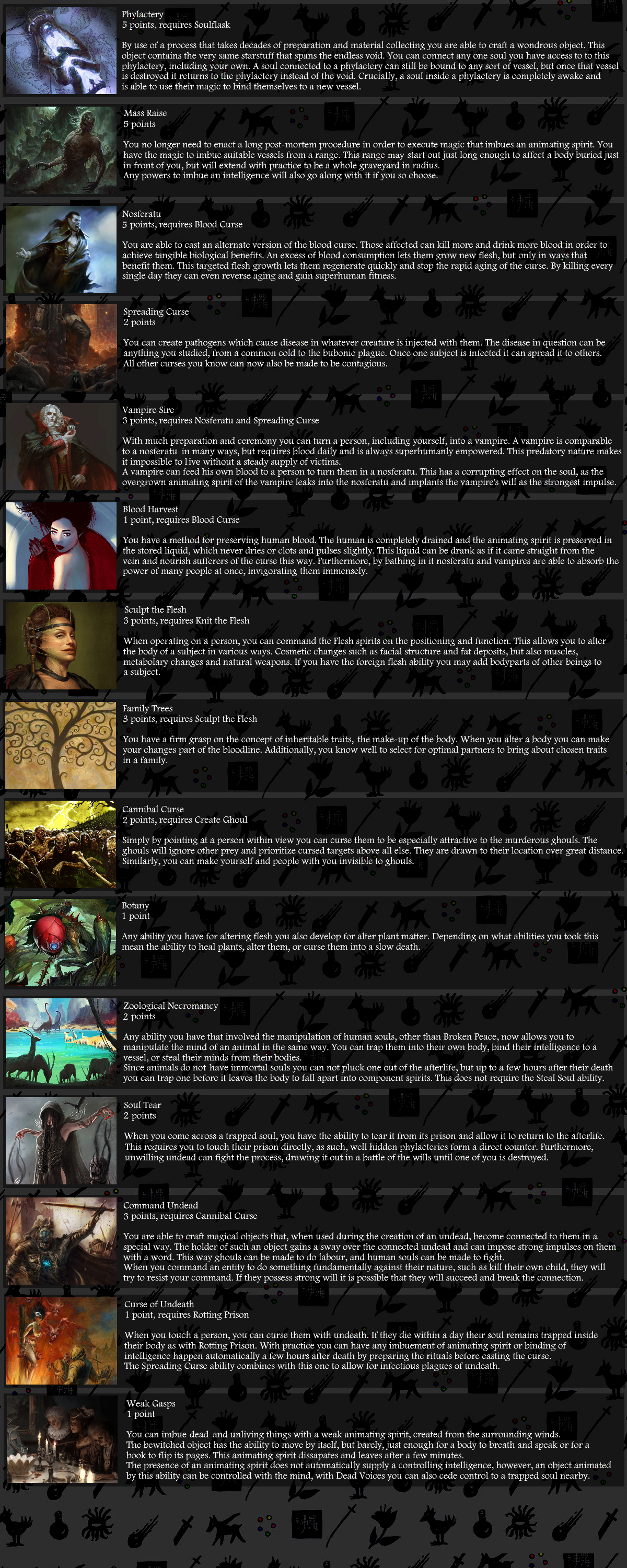 >>97373370>pactWhat sort of bidding am I doing?>broken peace (20)>soul flask (19)>blood curse (17)>knit the flesh (16)>foreign flesh (14)>heating the blood (12)>dead voices (11)>return to life (8)>steal soul (6)>nosferatu (1)>spreading curse (-1)>vampire sire (-4)>blood harvest (-5)>literacy>fighting>constructionforgetten third-in-line to a tiny fiefdom, given proper education for administrating a territory but no opportunity to use it>true bloodgoing for a vampire lord>creature of the night>abandoned ruinsI'll have them fixed up>operating table>armoury>crypt>lounge>workshop>confidante>steward>doctor>magical beastThe black dragon is on my coat of arms. It has its own roosting place in the top tower.>beasts x10two cows20 chickens3 horses12 pigs>worker x9farmhands and labourers to restore the ruins to their former glory>Nosferatu x9>VampireThat's like 40 vampiric knights for my round table. (or do I dare? do I dare take 7 vampires and have a family of 91?)I can also reward my allies with immortality.This does mean we have to go out raiding often, but I'll reserve a chamber in the castle for blood harvests so we have reserves and nobody attacks my peasant workers.Since I can preside over my own territory, I can have a few townships to feast on that won't have another lord to beg for protection.My public opinion is neutral, but it could sink if my blood tax is levied to high or on too concentrated a population. If it does, other liege lords might have a good excuse to try taking my territory, I'm banking on my retinue being enough to deter them.Additionally: has anyone ever considered repeatedly resurrecting victims using foreign flesh from animals and heating the blood? Functionally it'd let you turn animal calories into drinkable human blood for vampires, until eventually the victim has become too warped and no longer counts as human. Maybe turning animal calories into humans is what towns do anyway.