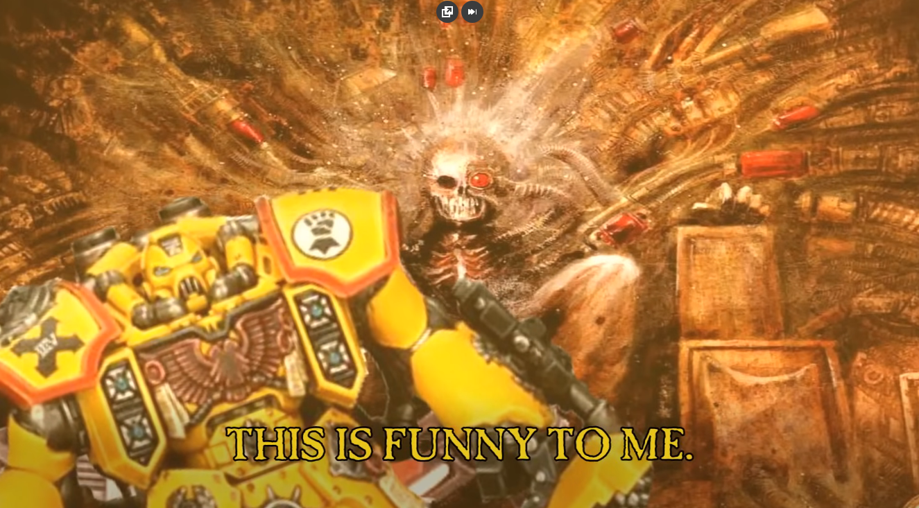 >>97380898>the soul of ityou mean cobbled together by overworked creatives happy to simply have a job working on model soldiers as a company?if so where's the fucking satire in WHFB? People forget that the reason why WHFB's empire is renaissance is because Byran Ansel loved that period.the soul of 40k was anything they could slop together from pop culture and steal from their older ranges. that's why it's by volume 20% 2000ad, 20% moorecock, 20% dune, 5% star wars 35% warhammer fantasy but in space.what in the warp is satire? i have the OG books. What is the work saying by making orks soccer hooligans, is it a big social commentary or is it "british humour", tongue in cheek.Is obi wan sherlock Clouseau supposed to mean something?or how the voyages of the spacewolf long during the first chapter approved is framed like a startrek a nod?40k is a gumbo, a stew a slurry. the satire you might see are the bits of KEKW floating to the top. That's Imperium being judge dredd mixd with Rogue trooper by way of frank herbert's dune, literally lifting Ixians and Navigators and spice if i remember in 40k.Also RT is like not really 40k as most people conceptualize it, start at 2nd ed
