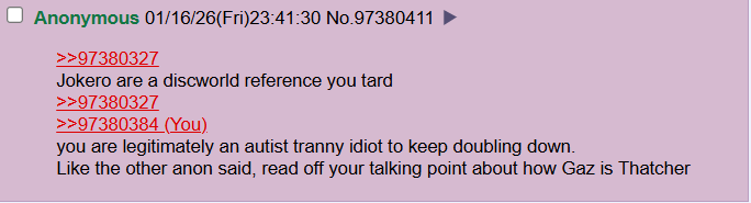 >>97381485Idk but it's always funny to watch them crash out online