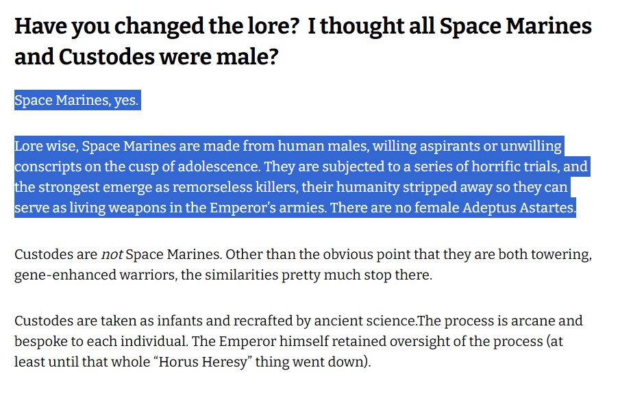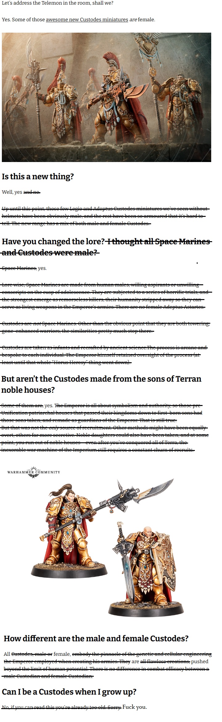 >Yes. Some of those awesome new Custodes miniatures are female.>Is this a new thing?>Well, yes and no.>Up until this point, those few Legio and Adeptus Custodes miniatures we’ve seen without helmets have been obviously male, and the rest have been so armoured that it’s hard to tell. The new range has a mix of both male and female Custodes. That sounds like a 100% yes to me. Where exactly is the "and no" part of your answer coming from James? All the old models were male because custodes were always and all-male group and now you shove women in there for DEI points, that's clearly something new. Absolutely trash tier gaslighting on display
