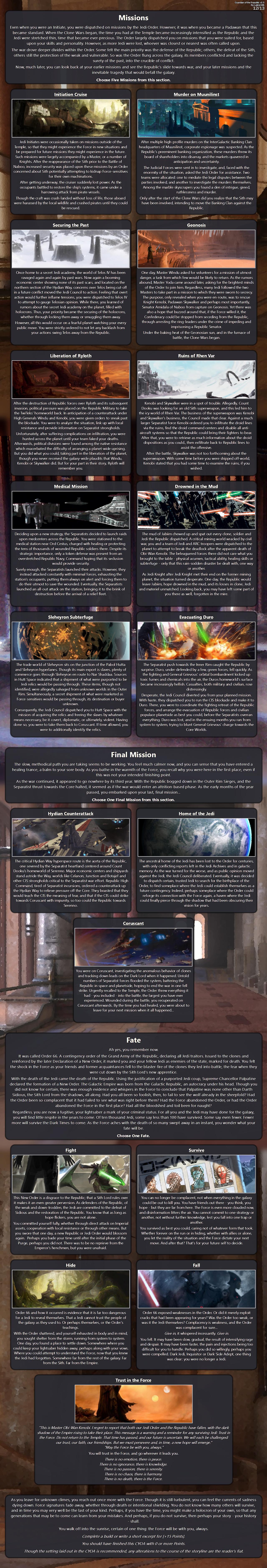>>97384234>Rank: Master [+275]>Species: Human>Origin: Baby [+2, +1 Int. Skill]>Homeworld: The Temple [+1 Force Power]>Perks:Agile [-10]Natural Warrior [-15]Powerful [-15]Relentless [-10]Strong [-10]Tough [-10]Quick Reflexes [-10]TIreless [-10]>Complications:Attachment [+10]Bad Influence [+8]Deadly Secret [+22]Notorious [+8]>Views: Typical>Archetype: Jedi Guardian [+2 Mar. Skills]>Force Powers:Telekinesis (Basic) [Free]Force Sense (Basic) [-10]Force Control (Basic) [-10]Mental Shields (Basic) [-10]Battle Precognition (Advanced) [-14]Advanced Tutamis (Advanced) [-25]>Lightsaber:Colour: BlueDesign: StandardMods: Concealed, Duelling Lens, Waterproofed [-9]>Lightsaber Forms: Form I, Shii-Cho [-6]Form III, Soresu [-8]Form IV, Ataru [-8]Form V, Shien [-10]Form VII, Juyo (Mastered) [-24]>Advanced Combat Techniques:Jar’Kai [-12]Sokan [-6]Trakata [-15]Unorthodox [-15]>Skills:Unarmed Combat Lv. 2 [-14]Awareness Lv. 2 [-14]Athletics Lv. 2 [-24]Stealth Lv. 2 [-24]Training Lv. 1 [Free]>Equipment: None> Opinions:The Separatists (Enemy) [+15]Corporate Sector (Enemy) [+8]Local Systems (x5) (Enemy) [+10]>Associates:Venina Andoni (Padawan) [-5]>Contacts: None>Missions:Securing The Past[Reward: Reward Perk (Smooth Operator)]Ruins Of Rhen’Var [Reward: Then Var Crystal (-5)] Medical Mission [Reward: Reward Perk (Clanker Killer)]Jungle Run [Reward: Reward Perk (Unsavoury)]Urban Ghosts [Reward: Reward Perk (Urban Ghosts)Highly martial Jedi Master duelist trapped behind enemy lines, hunted by Separatists and their allies, and hoping to get the information out of Order 66 to the public before it is executed. While Notorious for their actions during the war, they still serve the Republic, and will defend it at any cost. With a padawan in tow, it won't be easy to do so while training her at the same time.