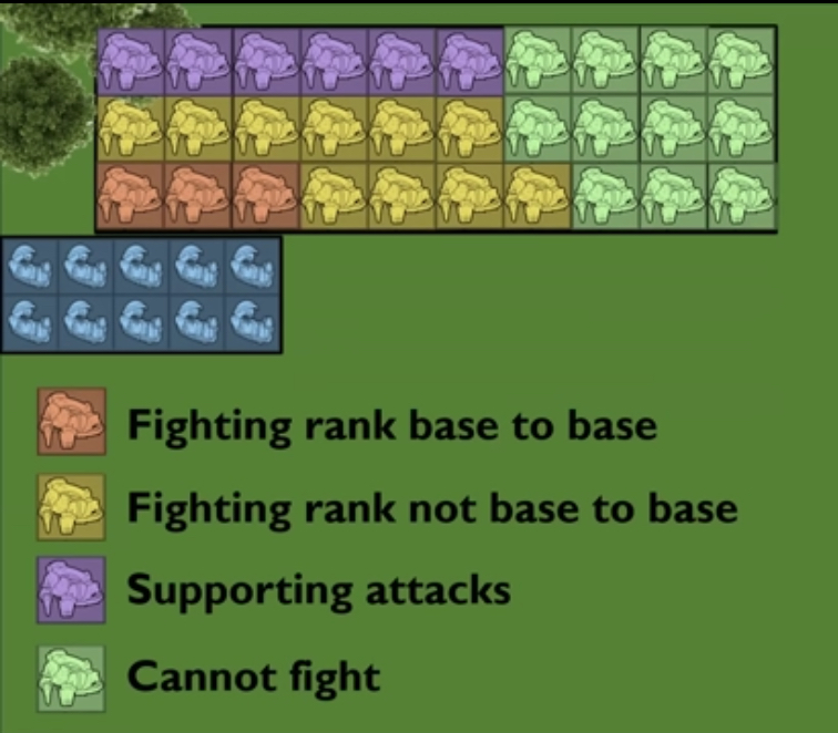 >>97390301You can be in the fighting rank and not be allowed to fight, if you’re outside your movement value of the enemy. Being in fighting rank no longer means you always get to attack.If you’re in base to base AND in the fighting rank you get all your attacks. If you’re in the fighting rank and NOT in base contact you only get 1 supporting attack. This is why the entire second rank only ever can get 1 attack max.