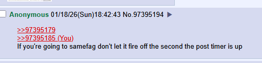 >>97395179>>97395185If you're going to samefag don't let it fire off the second the post timer is up