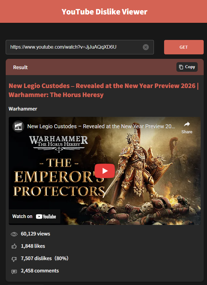 >>97394922>>97394944The problem with that addon is that it doesn't actually display the true ratio, but instead attempts to estimate what it thinks the ratio would be based on the dislikes from other people who have the addon.I have no stake in this topic; I just really don't like when people talk about that addon as if it has any worth whatsoever.