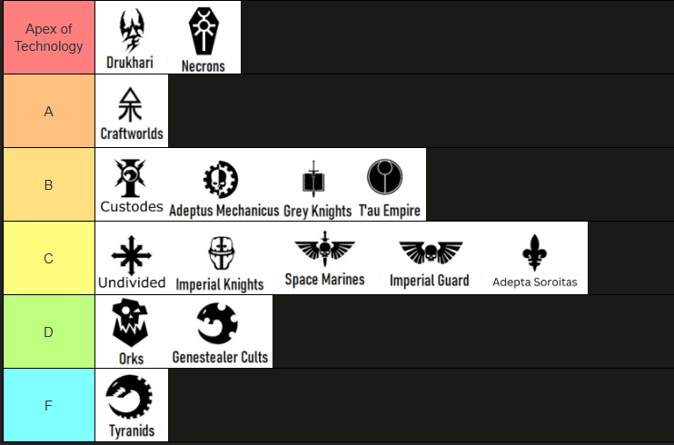 >>97396120Genestealers should be at F, Tyranids at B