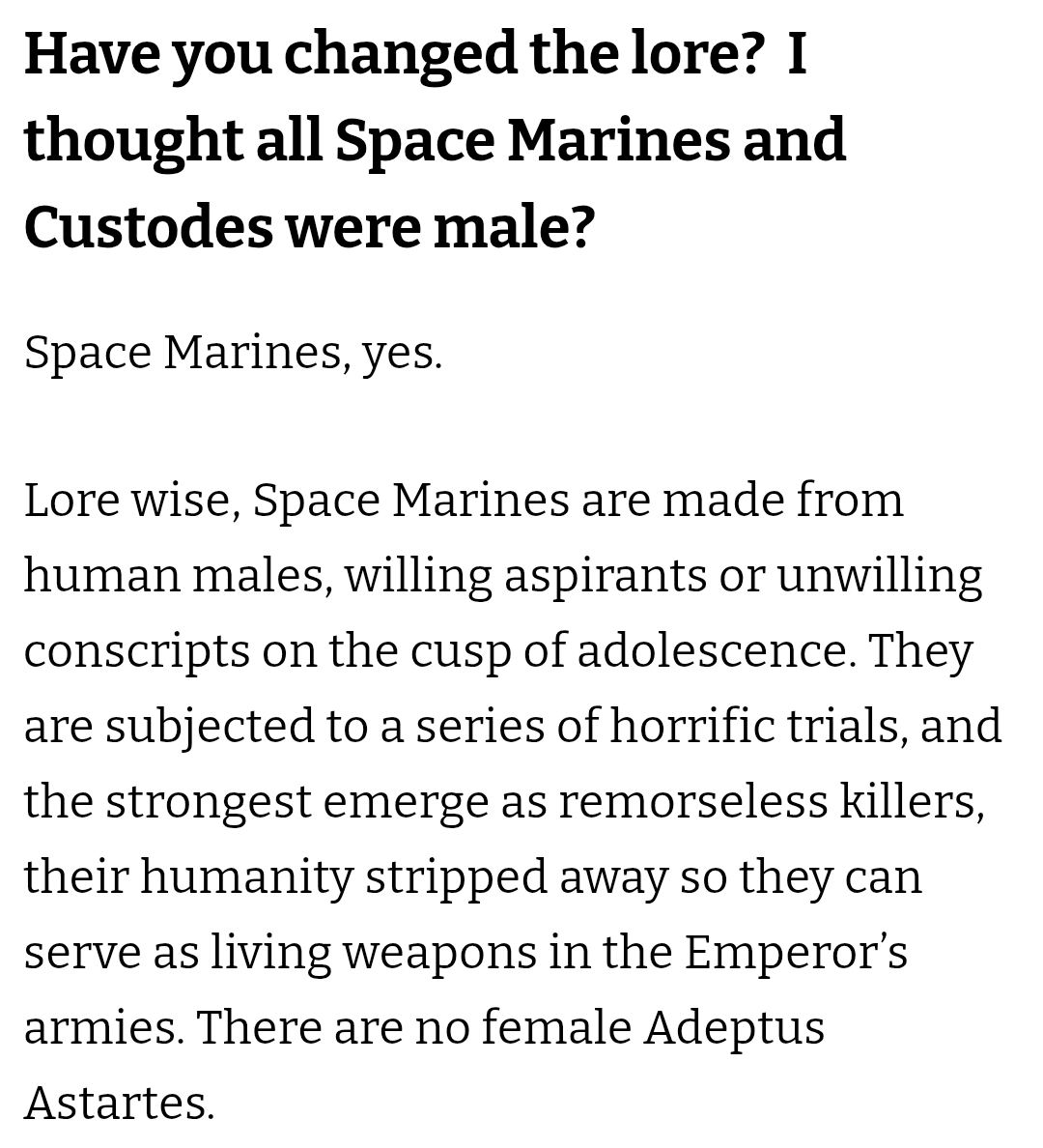 >>97396617this explanation is shitty, they don't talk about the Emperor specifically selecting only men to be aspirants or why he did so, they talk about how dehumanizing the process of becoming an Astartes is, as if that immediately disqualifies women from being one. Because women can't ever be abused into living weapons and single-minded killing machines, I guess?>that would be wrong. The Emperor only abuses men in this way because women can't ever lose their humanity lolActually reading it again,>There are no female Adeptus Astartesfeels like they're leaving room for there to be ones in the future, or implying they just get sex changes to male, or implying that all Astartes are nonbinary by default and sexuality/gender are irrelevant