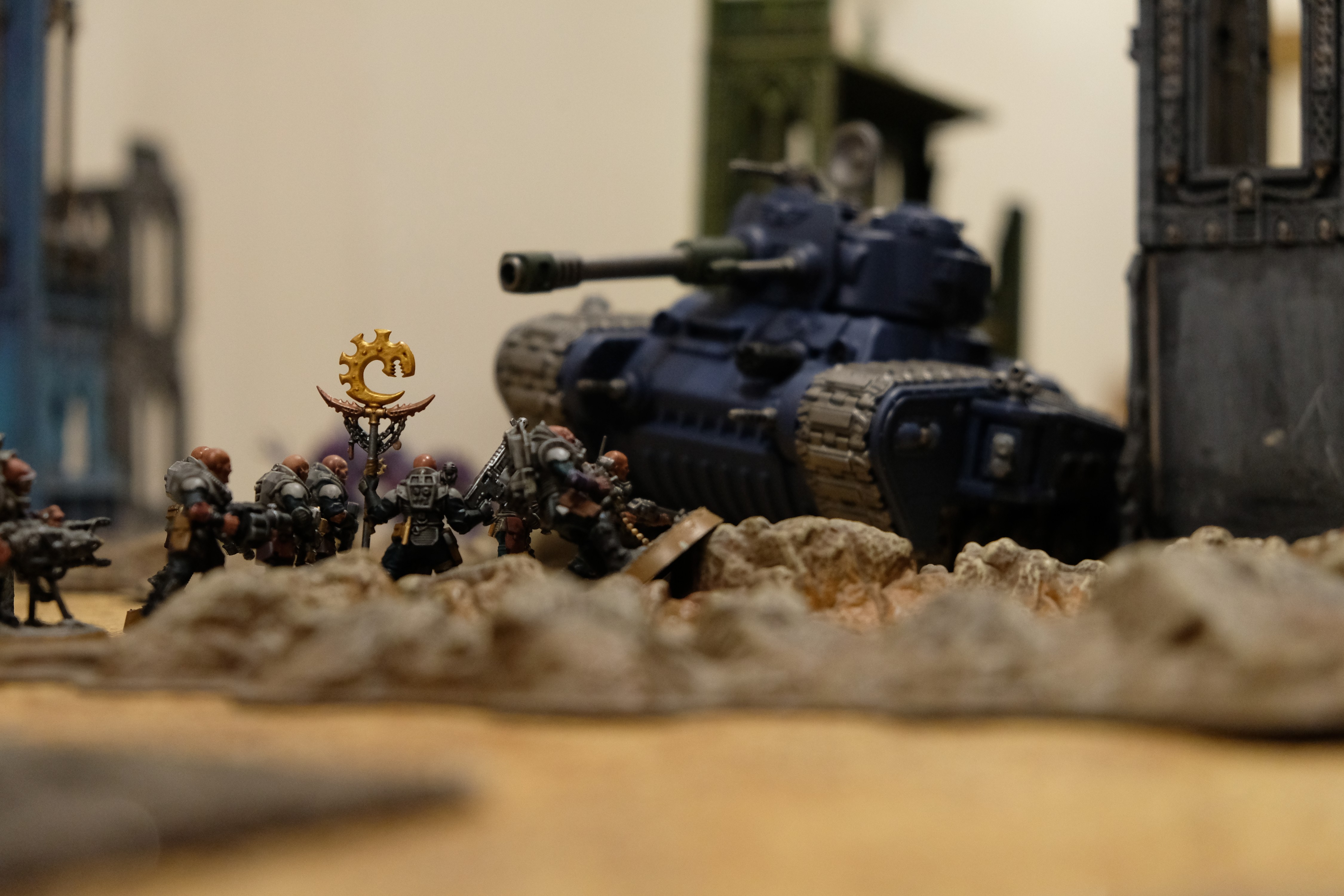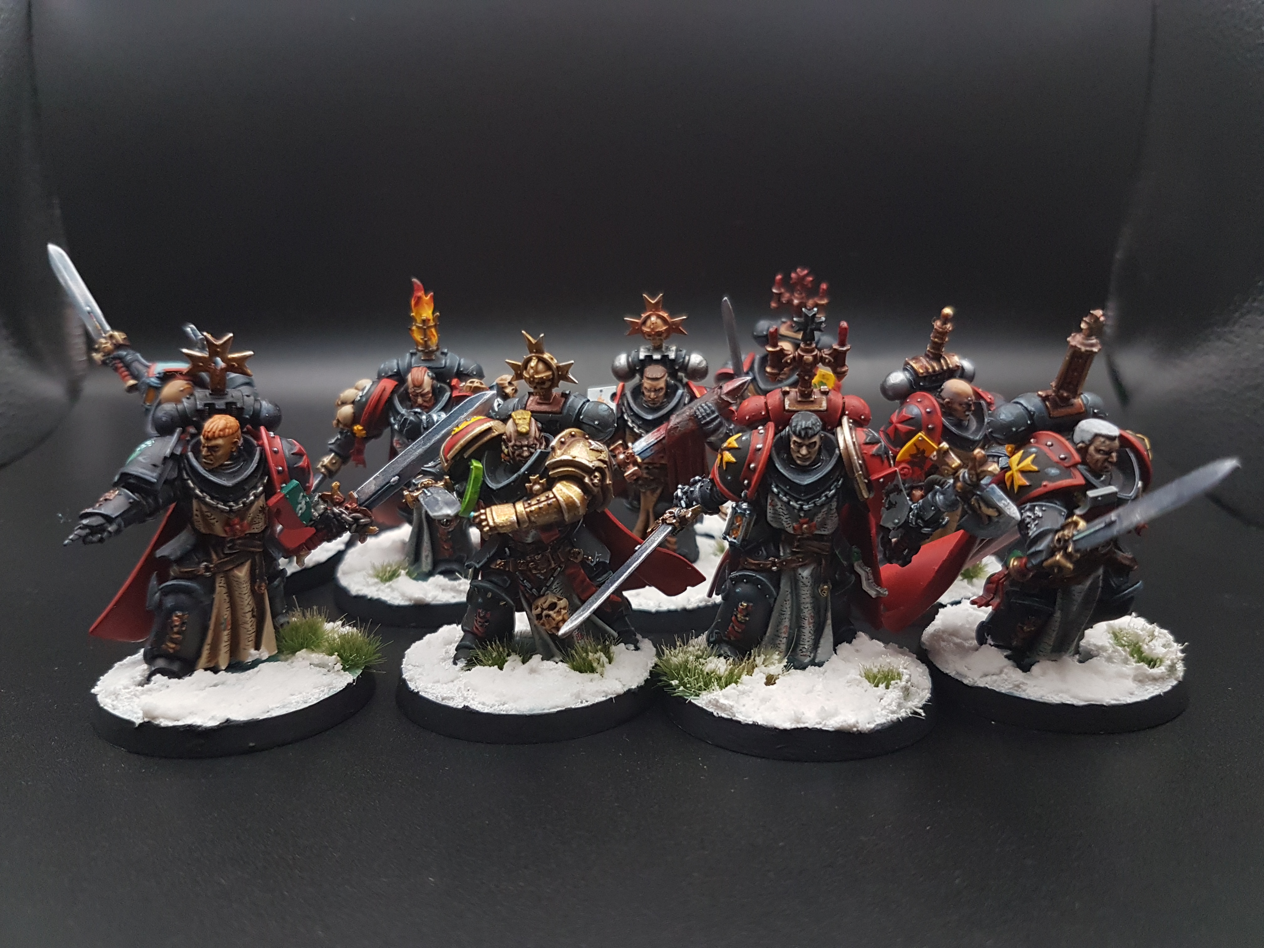 My BT footslogging infantry heavy list has:>10 sword brethren, all having swords and pistols>5 sternguards>1 judiciar>1 castellan>1 emperor's championFor now I have>Castellan leading the sternguards>Judiciar with 5 sword brethren>Emperor's Champion with 5 sword brethrenBut maybe I should have the Emperor's Champion going solo since he has M8 and Lone Op, and have the castellan go with 5 Sword Brethren and the judiciar go with the other 5, leaving the sternguards alone.Any thoughts? I feel like it would be a "waste" to not use the Champion's Lone Op, but I'm afraid he would still somehow get baited and shot off.Also is it good to have two 5 men squads of Sword brethren? Are 10 men squads of sword brethren led by a judiciar too overkill?