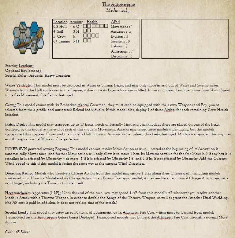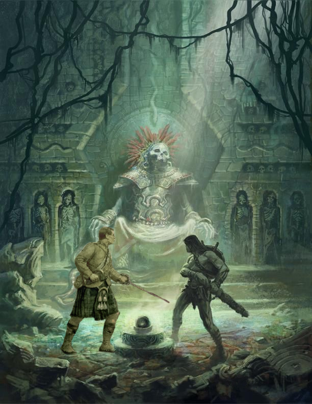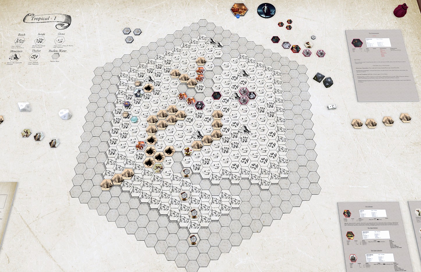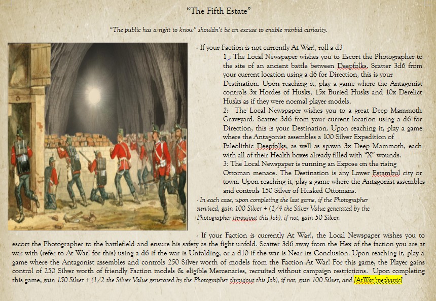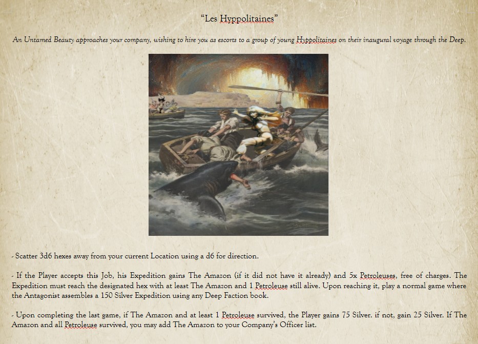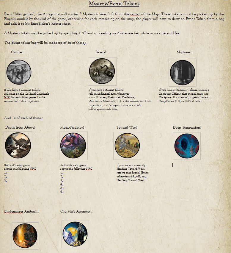 For a connection to the 7th, i'd really like to work out something with Arne Saknussemm, who supposedly made it to the center of the earth. Maybe his grave is somewhere on the island? Or some cache left by him? The tablet could be some Old Mu document regarding him in some manner. If we go with the idea it's some eldritch artifact, then i'd want to add Samuel Kleinschmidt as a Character with some ability related to that (such as the ability to use Muic Maledictions, or Parley with Eldritch Encounters). On a similar note, if anybody has ideas for Frisian or German Hero Traits let me know, it'd be nice to have those for the same of completeness, but if there isn't some mechanical benefit to having them they shouldn't be added for that reason (and the Germans are arguably already represented through the Eider Officer).