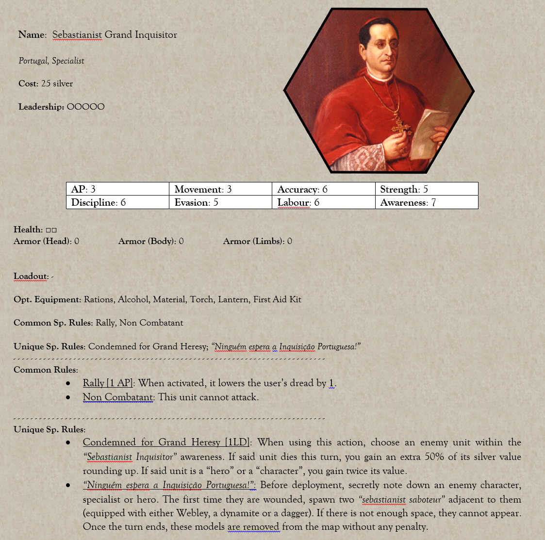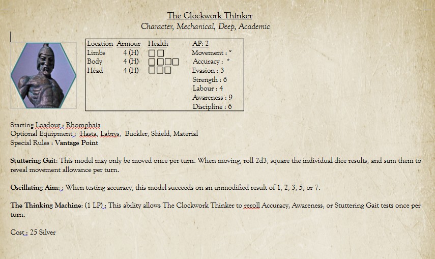 It seems natural to me that Lost Men's hero would be a copycat hero that lets you use any Colonial hero for cheap but with worse base stats. So, it'd only need those base stats and Faction Traits.