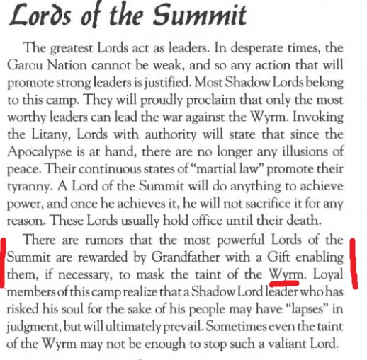 >>97409270Your presumption that I must be a noob to WoD because I'm playing a 5th edition line is amusing.The Lords of the Summit were always the dominant camp of the tribe btw