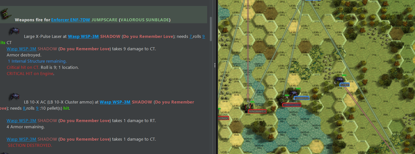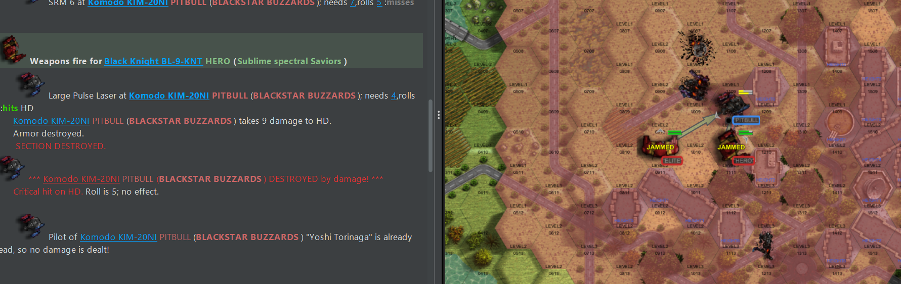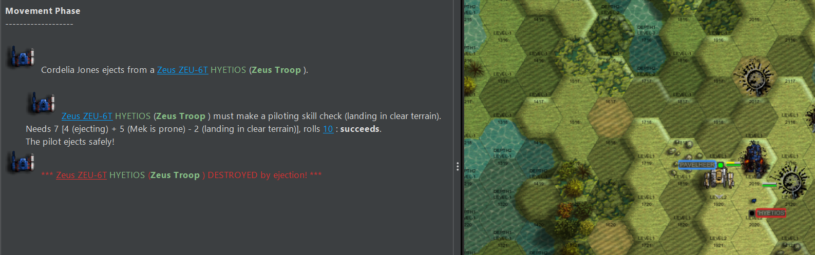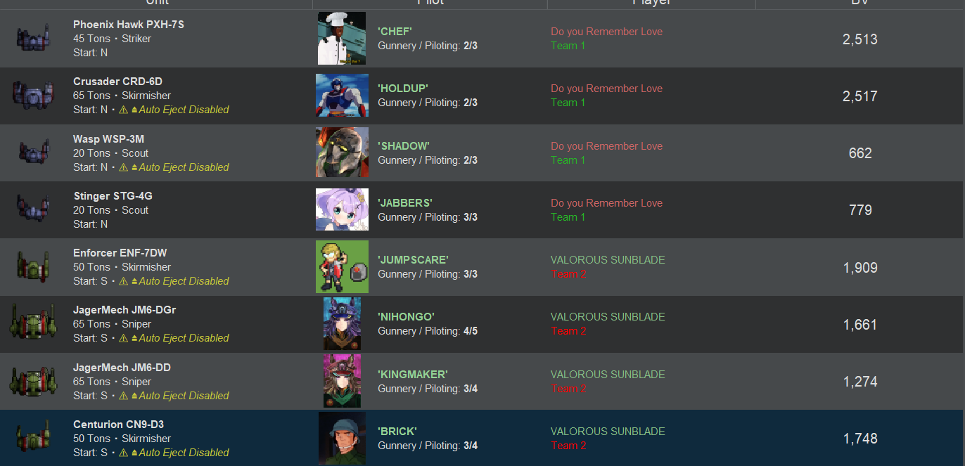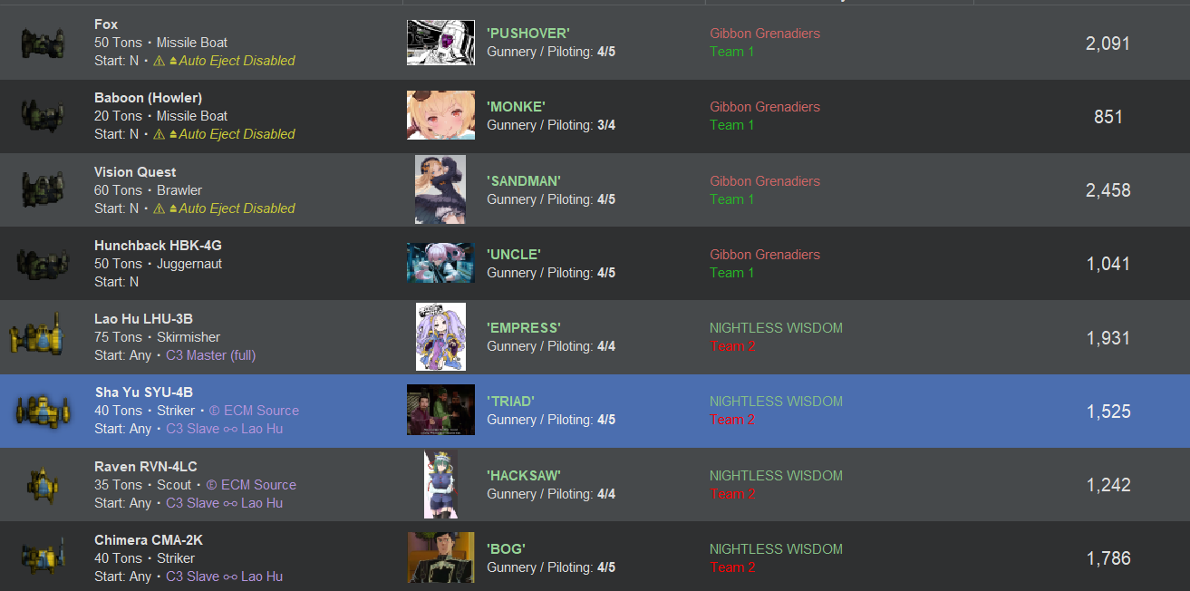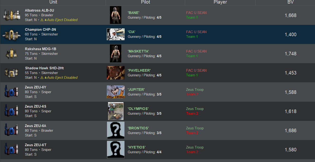 >>97412265>>97412313>>97412356>>97412409>>97412466>>97412486>>97412497That seems like it was a pretty entertaining match. You might also want to count pilots that have ejected as autofled since it does seem to cause issues with the AI. Also is there any way to make the replay show who is who as its kind of hard to follow what is going on?