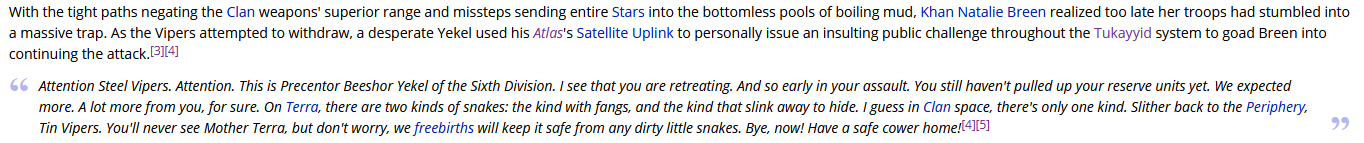 >>97411393Smoke Jaguar heritage is being so retarded the clans had to hotfix an honor system in so they could actually accomplish things