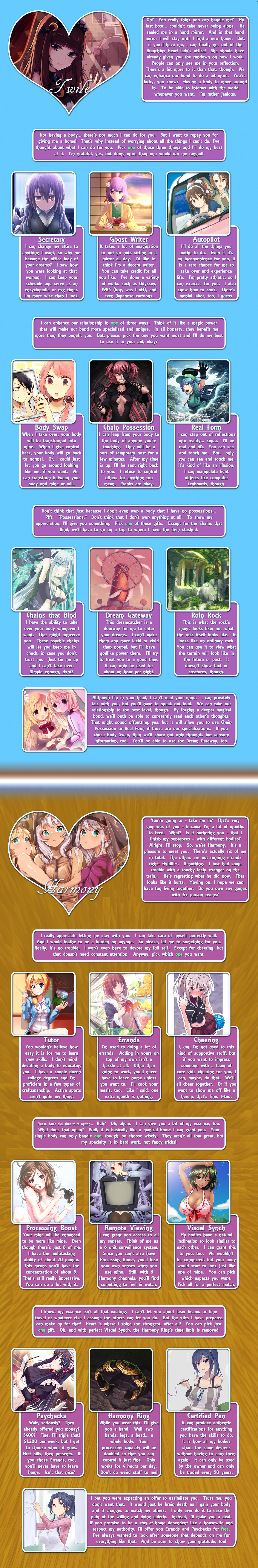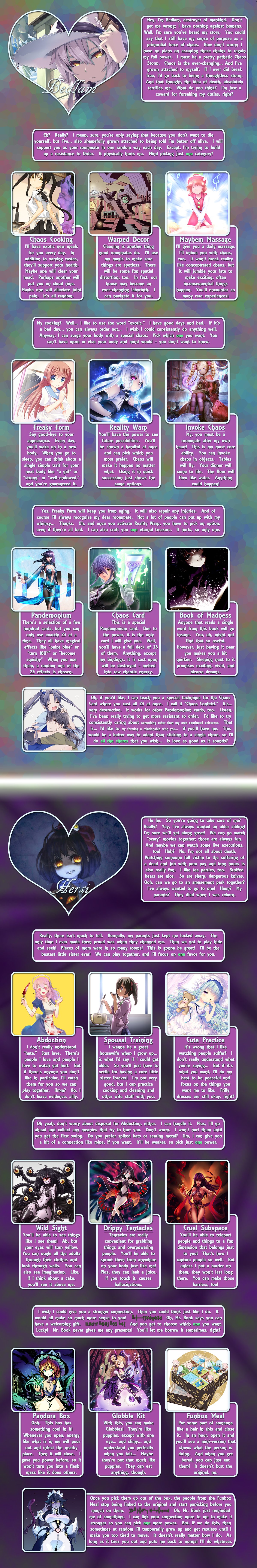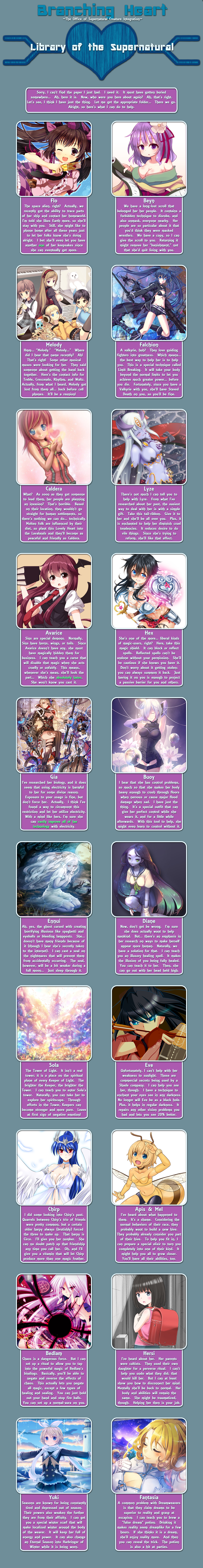 >>97414276Library, page 2.Requires a perk from page 1 to access.Just like in Planeswalker Rising. It's bad design and shouldn't be copied imo, there's no indication how you're supposed to handle it on replays when you already know the info.And that's all of Branching Heart, by Beri. The end.