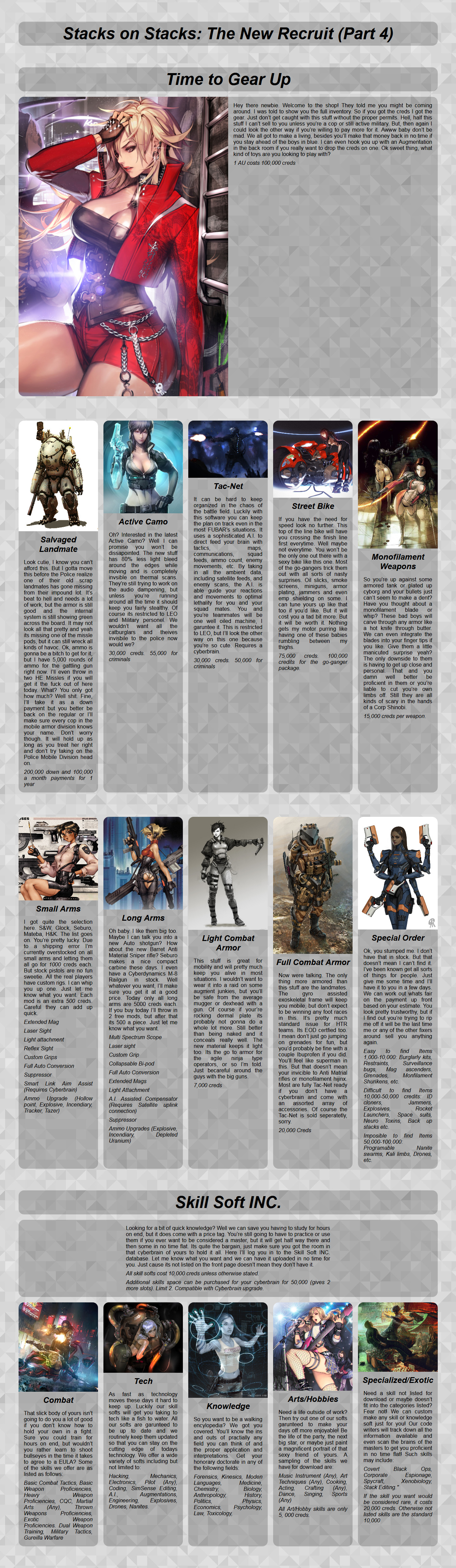 >>97414222>>97414209I think posting long cyoas in full is bad in some cases but not others. For example it's bad if:* if it's a cyoa that was already posted in full very recently, like with Platinum Age which was reposted in every thread because people kept making builds for it - in that case linking just the album is good* if it's in the middle of more relevant ongoing things, disrupting from them - that's spamming in a literal sense* if it's an extremely low quality cyoa - high school anime is what i mean here of course* if there's already very many images in the thread so it pushes the thread to fast towards the image limit