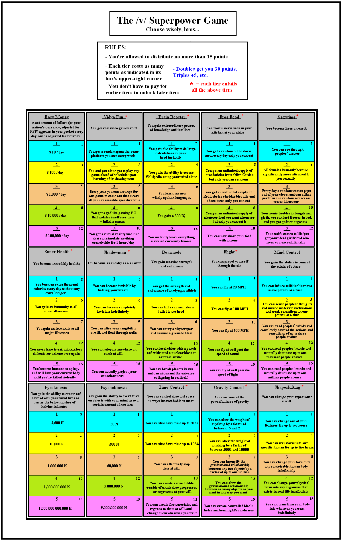 >>97414965>Rolled 21769931ok, no dubs or trips, so I only get 15 points...>Easy MoneyTier 3: $1,000/day>Brain BoosterTier 4: 300 IQ>BearmodeTier 1: Strength and Endurance of an Olympic Athlete>PlanUse my money allowance and my high IQ to amass as much wealth as possible, and use it to help others and potentially change the world for the better.