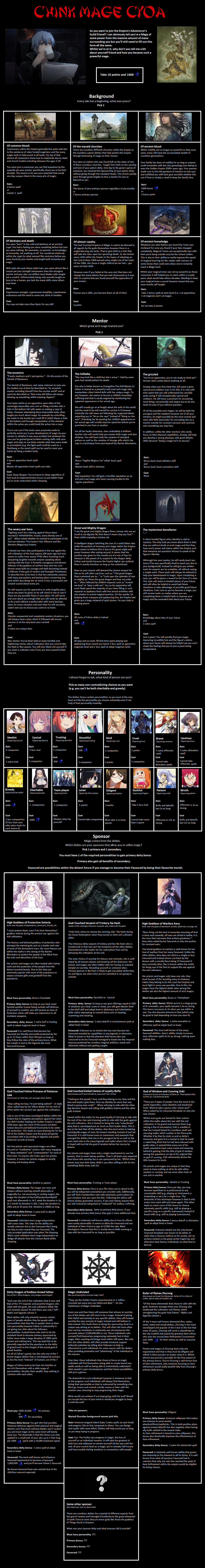 >>97416788Actually I am doing something like thatThe CYOA has 3 different kinds of points you go on adventures to earn points and some special rewards then each kind of point has its own kind of drawbacks available and then the adventure starts.