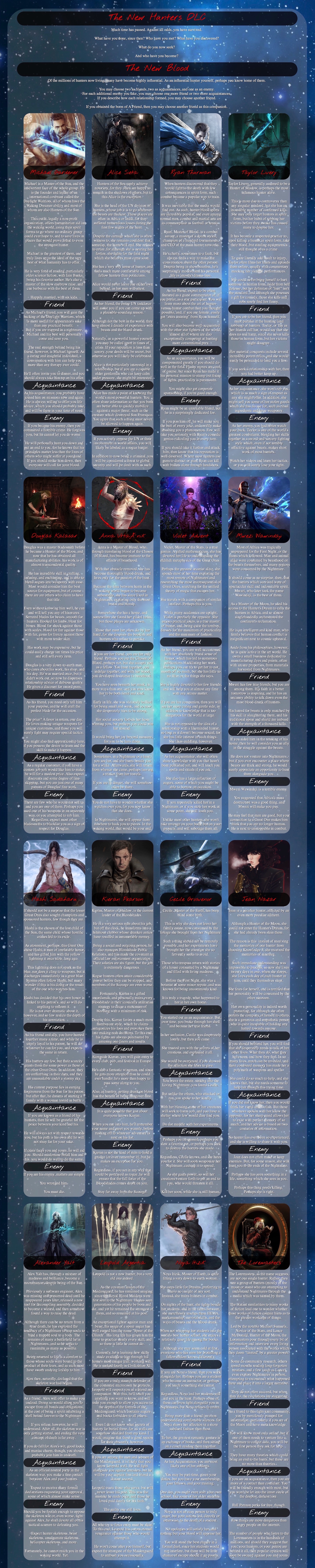 >>97414630>>97414732Also, lore vampires don't get to design their sires, if you want a lore accurate experience then you should roll instead of choosing.