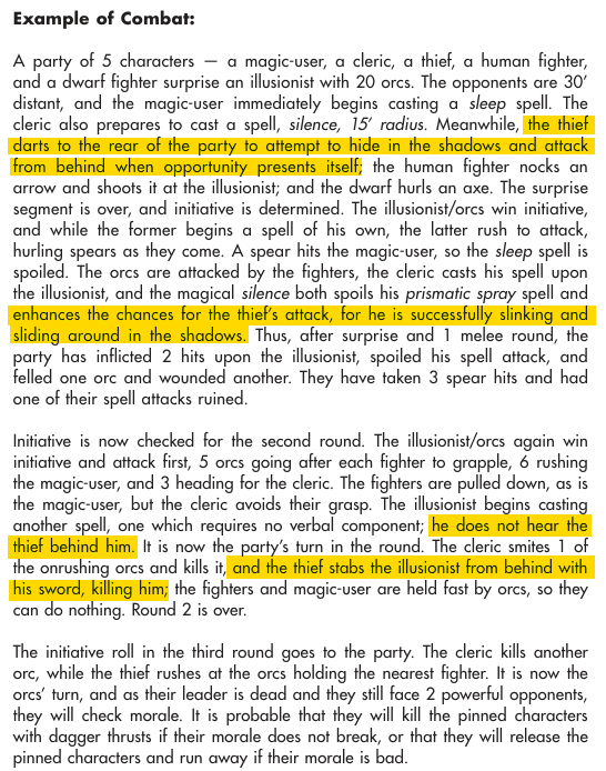 >>97450191I play OD&D 3LBB. Short answer: these abilities are already baked into fighting men and magic-users. Long answer below.Pick pockets: No real rule for this iirc, I allow a d6 roll, usually a 1 for success unless the player has some advantageous circumstances.Open Locks: Knock spellFind/Remove Traps: Magic sword trap sense ability. I also allow players to describe how they look for traps, and most of the time if one discovers the mechanism (majority of my traps have a specific mechanism, and I like to draw them up when I can), the trap is easy enough to avoid or disarm. Poison needles in locks, though, I leave to the sword. Or they let the retainers mess with it...Move Silently: Elven bootsHide in Shadows: Elven cloakHear Noise: Anyone can do this provided the party is sufficiently quiet. 1-in-6 for humans, 2-in-6 for elves, dwarves, and hobbits, as with listening at a door. My players have never taken the time to listen anywhere other than at a closed door.Climb Walls: Spider climb spell in AD&D. No real solution to this in OD&D, so I just let fighting types climb rough surfaces assuming they are unarmored, d6 roll depending on the conditions. This applies to fighter-type monsters as well.Read Languages: Read languages spell.Essentially, all of the thief abilities were just taken from existing mechanics, spells, or items. These all are not a problem if the DM takes the time to thoughtfully place some special treasures that the party can use. In OD&D every self-respecting party should hunt for Elven boots and cloak, and they're bound to find a magic sword eventually (for better or worse).
