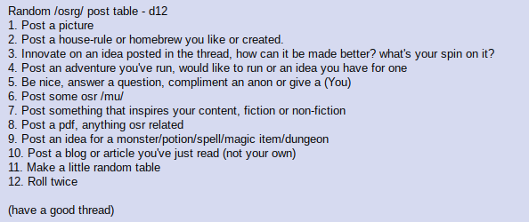 Welcome to the Old School Renaissance General, the thread dedicated to first-decade, Gygaxian D&D, its faithful modern clones, and content created for use with them. Later editions (2e and newer) should be discussed elsewhere.Broadly, OSR games encourage a tonal and mechanical fidelity to Dungeons & Dragons played as intended by its creators from 1974 to 1983 — less emphasis on linear adventures and overarching metaplots and a greater emphasis on player agency.If you are new to the OSR, welcome! Ask us whatever you're curious about: we'll be happy to help you get started. We also have two excellent beginner guides created by Anons with feedback from the thread that you can check for help:>n00b DM's Guidehttps://pastebin.com/EVvt6P0B>n00b Player's Handbookhttps://pastebin.com/XALkXkV0>Troves, Resources, Blogs, etc:http://pastebin.com/9fzM6128>Need a starter dungeon? Here's a curated collection:https://archive.4plebs.org/tg/thread/94994969/#95006768>Previous thread:>>97390490>Thread Question:Have you ever run a underworld style campaign before?