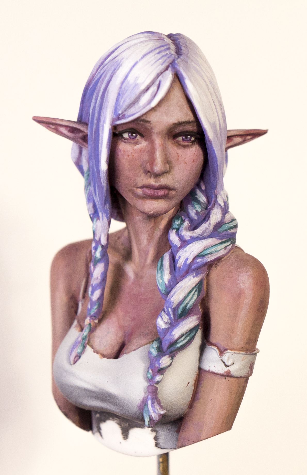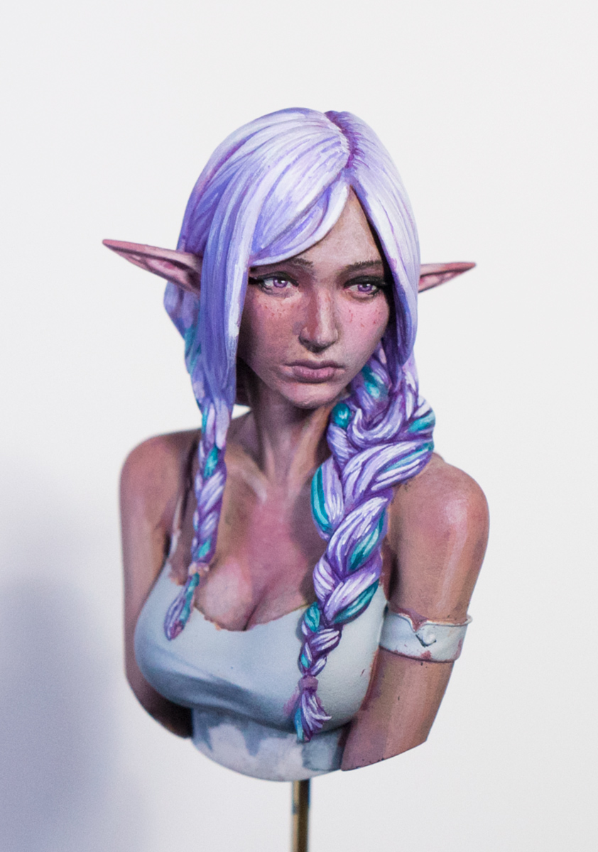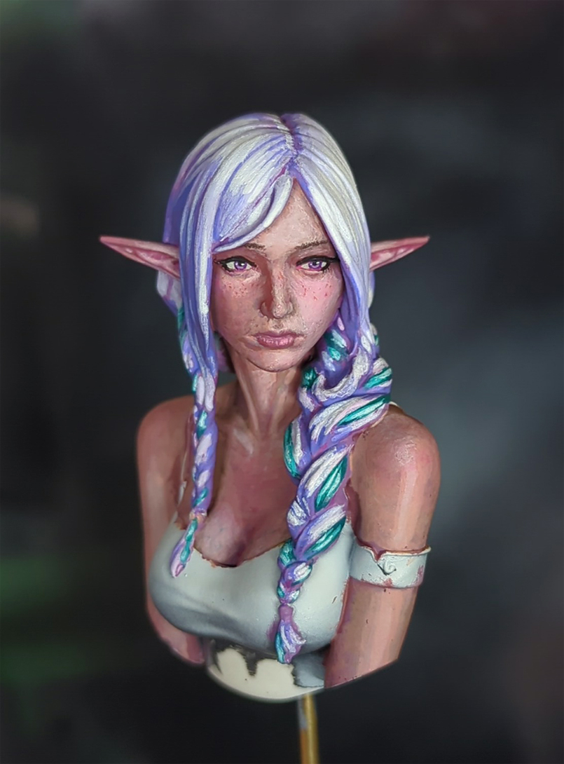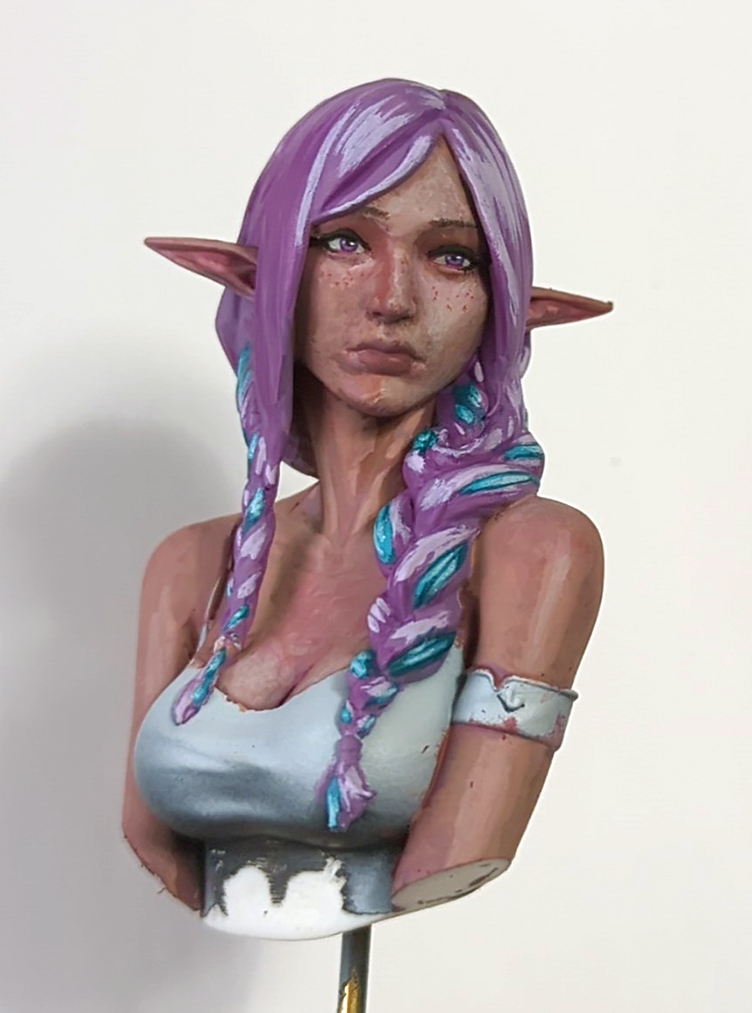 I had to repaint all the hair in because it was reading way more pink than I wanted, despite using only purples. But I guess that's good to know for doing pink hair in the future. I shouldn't be this messy with the hair to start since I'm basically going to have to repaint over each little chunk in the braid at this point, but if you squint it looks about how I want now. And reddened up the cheeks a bit, not sure if pushed far enough though.Most importantly added a subtle boob vein>>97432805Cool. Are you gonna flock the base or something like that, or leaving it plane like that?>>97432638Yeah, I think everybody likes ambient occlusion? It's basically what washes do, and zenithals also sort of do it a little by default. Like anon said it's just a real life thing so I don't know why people wouldn't like it.