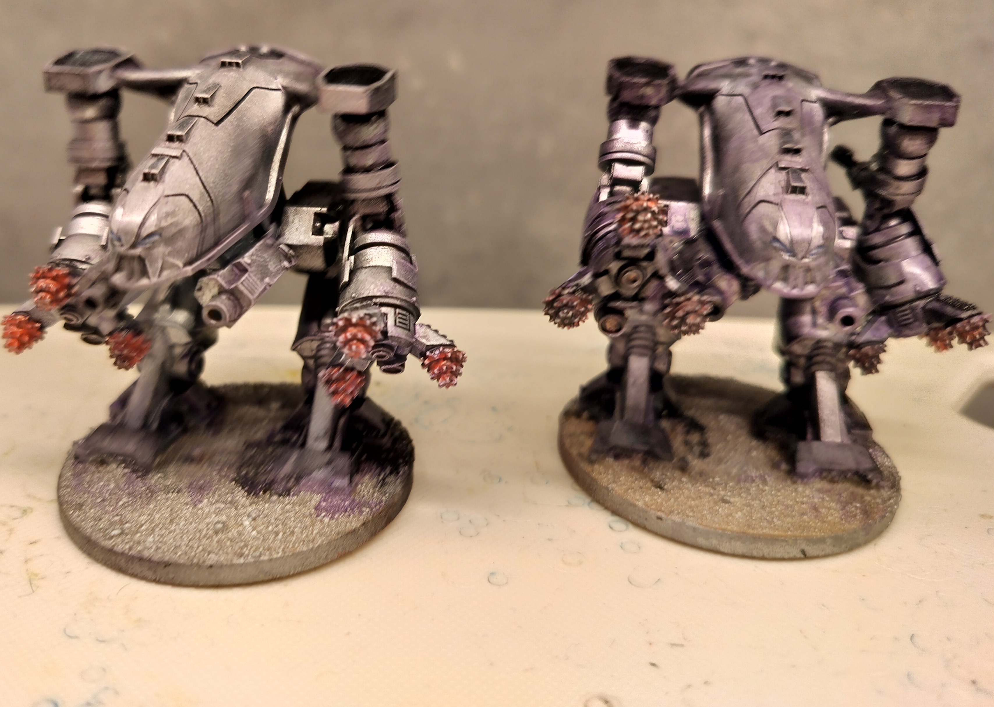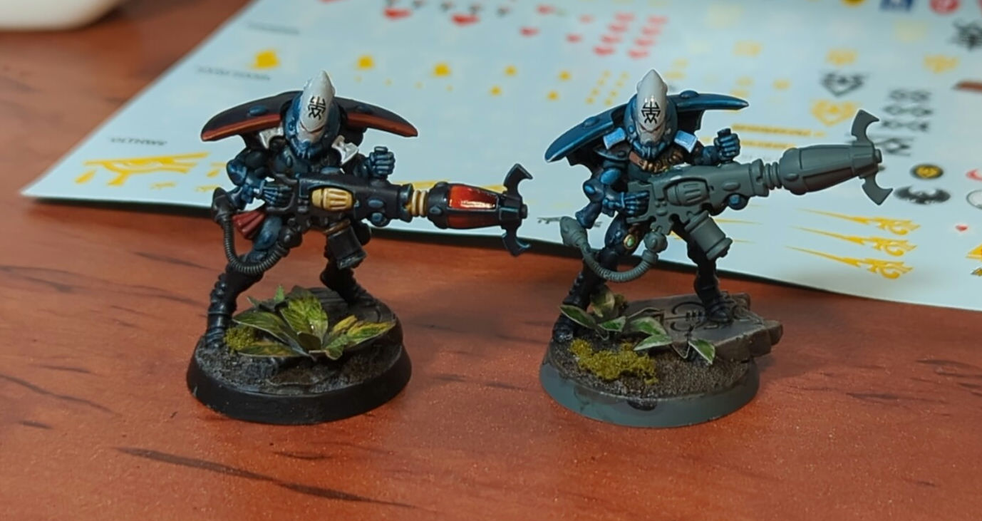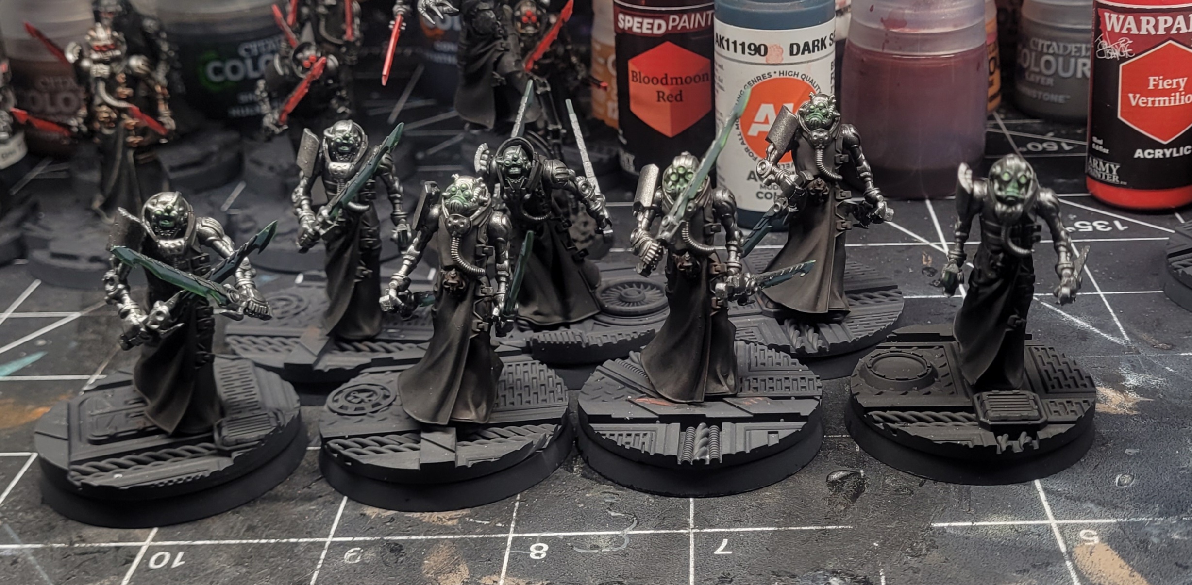 Made a lot of progress on my ruststalker conversions. Decided to make their swords different colors to differentiate between squads. So 10 will have Jestream Sam red, and the other 10 are going to have a green that I use on other models in my army.