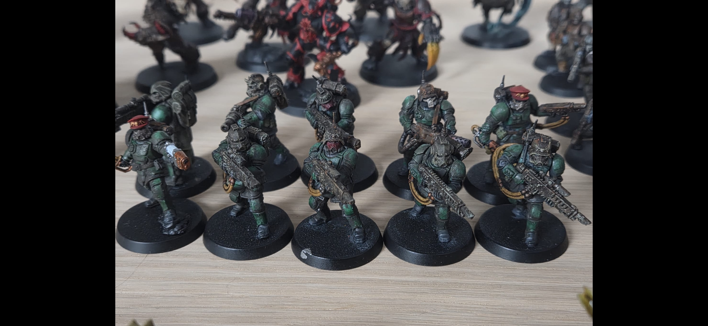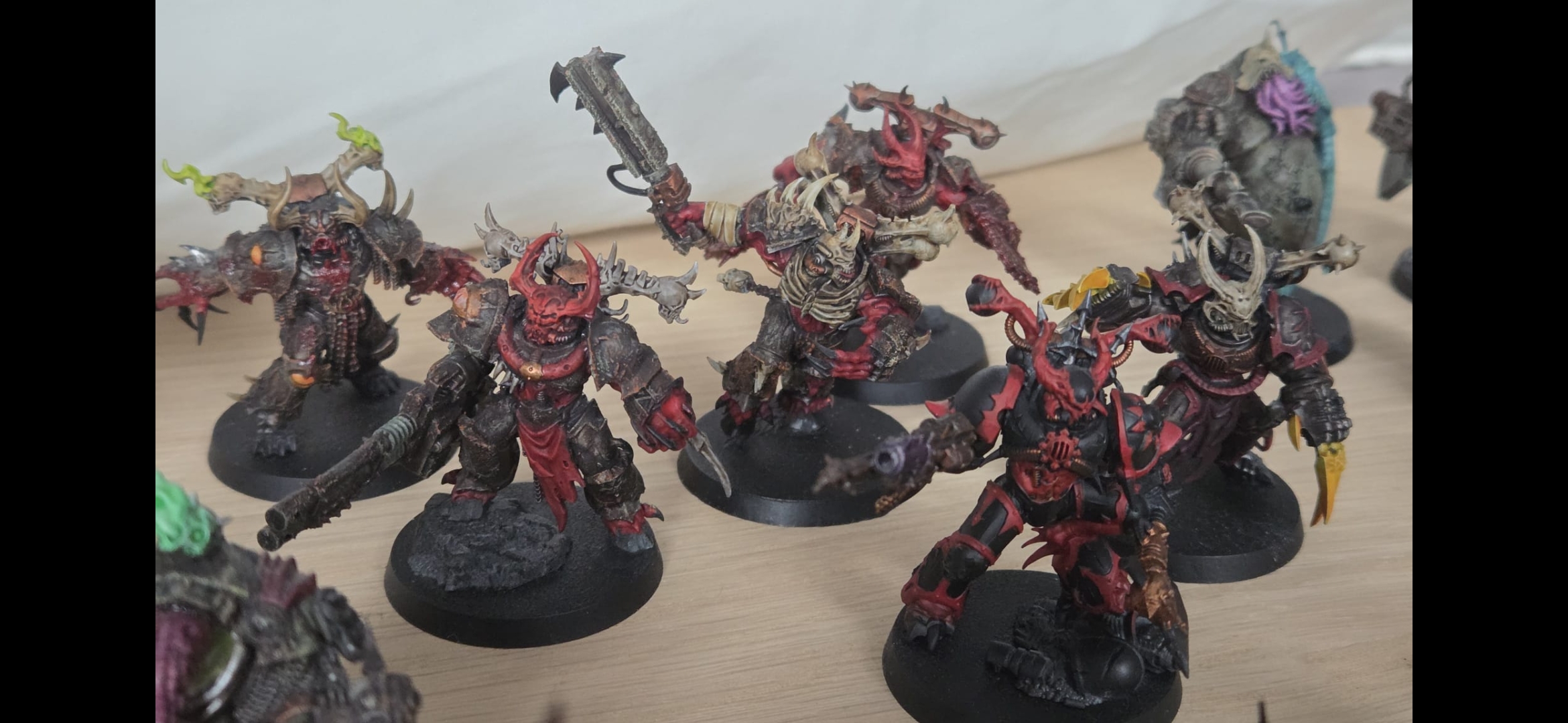 >>97431503Yeah, like I said I had no idea what I was doing with the scheme so I tried a lot of things and ended up with an army that just looks vaguely coherent. That's why I was thinking on stripping or airbrushing white or black all over them and start fresh with a clear vision.I did actually select the ones that I tried experimenting on.The left termagant and leaper are my first 2 painted minis so I kinda wanna leave those 2 like that to track my progress as the other anon said.