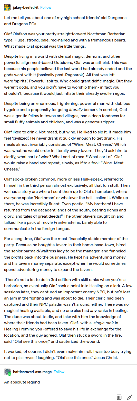 >>97553623Yep, i never been a fan of it but the more i grow older the more i'm more accepting of the "roll first and the narrate what happens based on the result" procedure rather than the "describe your action and then roll the die". Right now i'm more of a "express your intent and leverage in general terms and then describe your action according to your die roll result" GM but every time i read/hear these stories i move one inch towards the "roll first -> describe second" way.