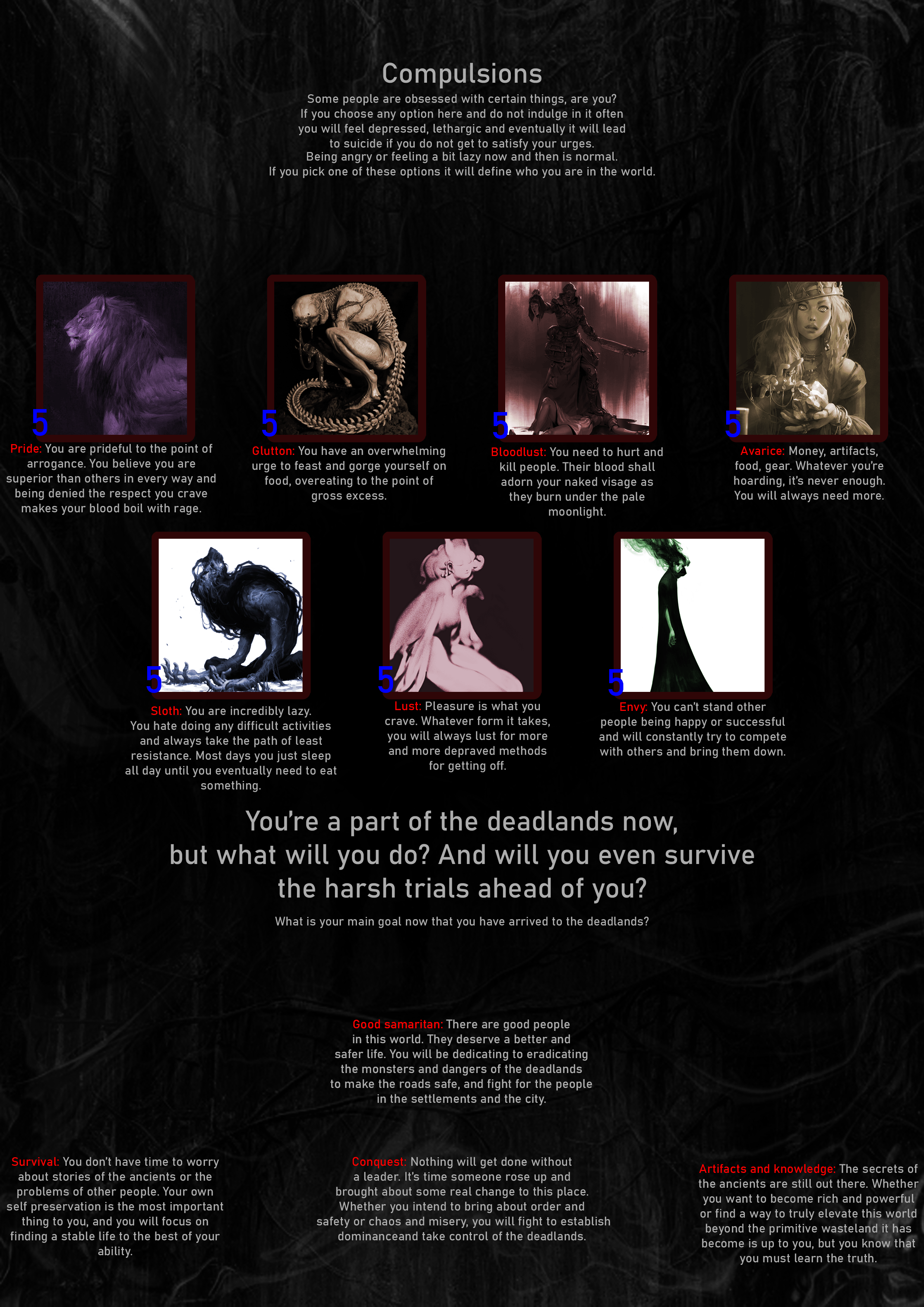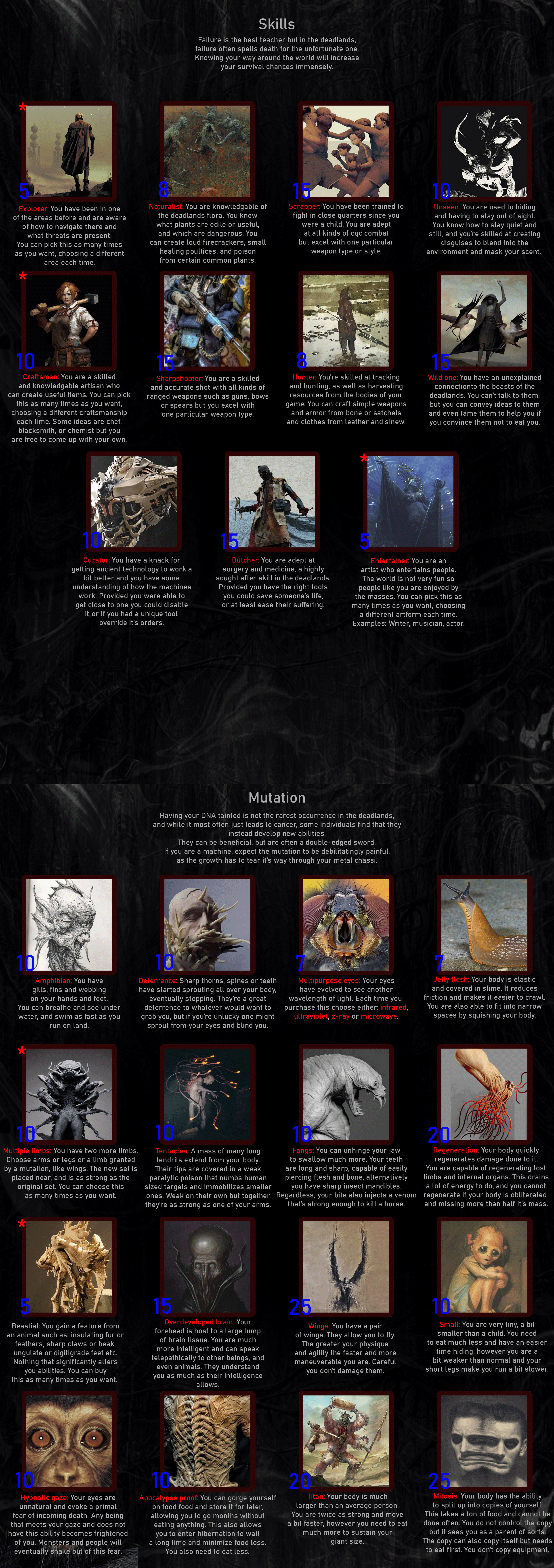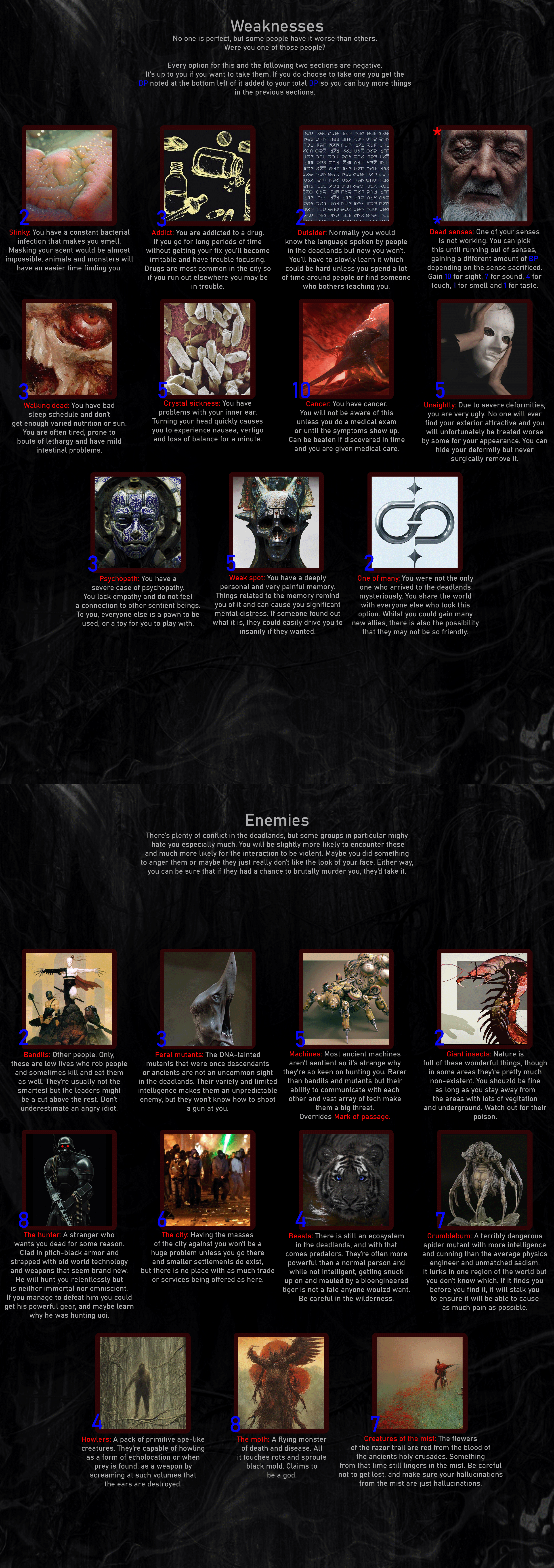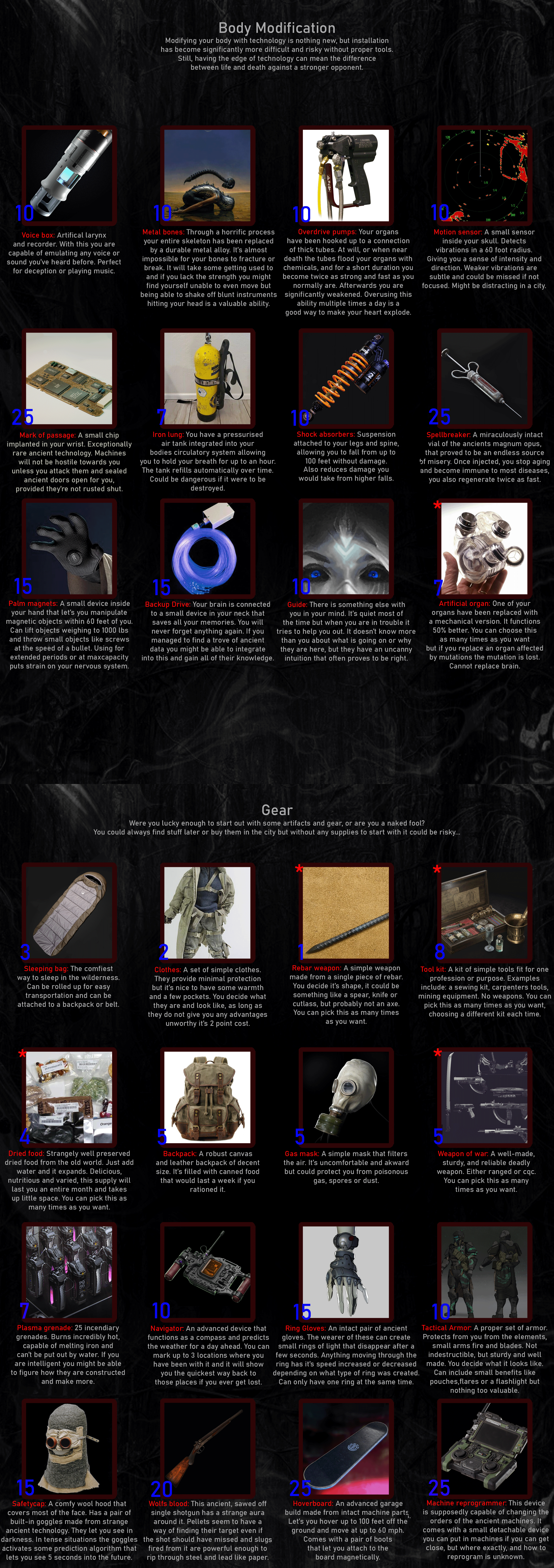 >>97443915>WhereVaults>FormMutant>Traits2 Physique, 3 everything else>MutationRegeneration>Body ModificationMark of passage, Spellbreaker, Backup Drive>GearRebar Spear, Rebar Machete>WeaknessesAddict, Outsider, Walking dead, Cancer>EnemiesBandits, Feral mutants, Giant insects, The hunter, The city, Beasts, Grumblebum, Howlers, The moth, Creatures of the mist>GoalArtifacts and knowledgeSleep at the vaults, in a room that need the Mark of passage to go in and out, a clean one. Can get food at the mindbridge if I don't find any inside the vaults.Not having Explorer is a minor problem with the very high Traits, both the vaults and mindbridge aren't that dangerous.None of the drawbacks should be a big problem, with my Luck I will find a way to know about and deal with the cancer early (even if late, Fortitude 3 with double Regeneration should make surviving removal easy), Addict and Walking dead only need some time and discipline and Outside won't last long with Brainpower and Perception 3 to listen on the peoples at the mindbridge.
