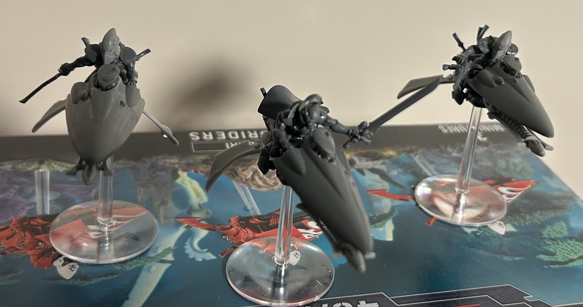 In honour of the Corsair comeback I finally built these Corsair jetbikes.Cape is from harlequins kit and the weapons in their hands are from the void scarred KT kit. Corsair Jetbike upgrade sprue was from China. Terrible picture but they are done!My god these were a pain to build.