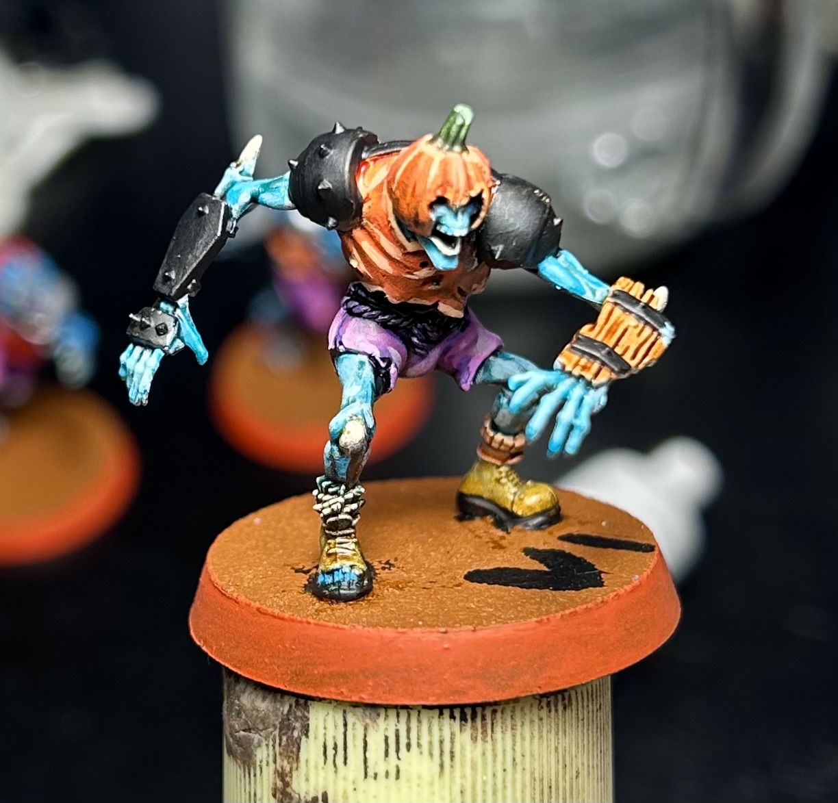 Gorath is all done. It was my first time doing a few things: black armor, a glass bottle, and horns. I could have made the stone tiles on the base a bit more interesting, but it's fine. I think my biggest failing was on the mace and I just sort of gave up on it at a certain point. I need to improve my metallic work.