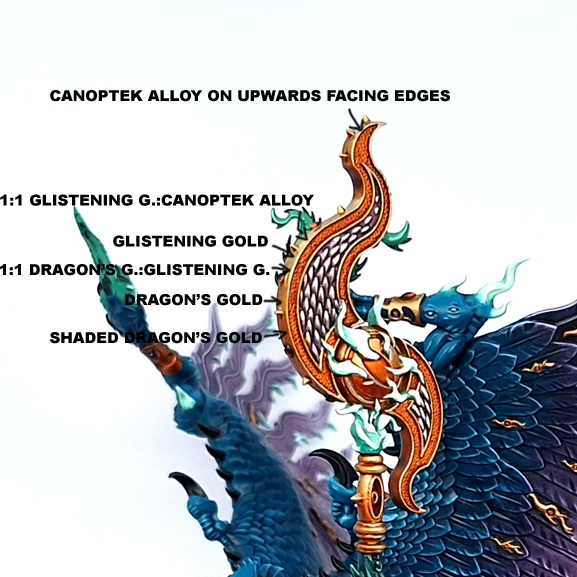 >>97447485Hey thanks! I'm just patient and precise honestly, anyone can reach this level with practice. Anyway that gold is not finished yet, it's just washed for now. What I do is this>retributor armor/ttc dragon's gold basecoat>wash with a 1:1 mix of gore-grunta fur and magos purple with additional passes for deeper shadows and recesses>reapply retributor on upward facing areas>layer liberator gold/ttc glistening gold towards areas that would reflect light by adding it to retributor armor>canoptek alloy edge highlightsI made this image a while back for a different anon that asked me about the gold, should help you visualize the steps.