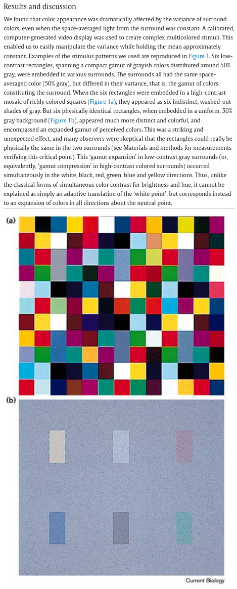 >>97449184> fuckin magic eye picture where it turns into something else if you look at it long enoughMetamerism is a thing, but I don't think that's what >>97449125 means here.Colours absolutely read differently depending on the colours that surround them, see pic related. The top and bottom images both have the exact same coloured rectangles, but they read as very different colours and saturations depending on the colours that surround them.Src: Color appearance depends on the variance of surround colors (1997, R.O. Brown, D. I.A. MacLeod)