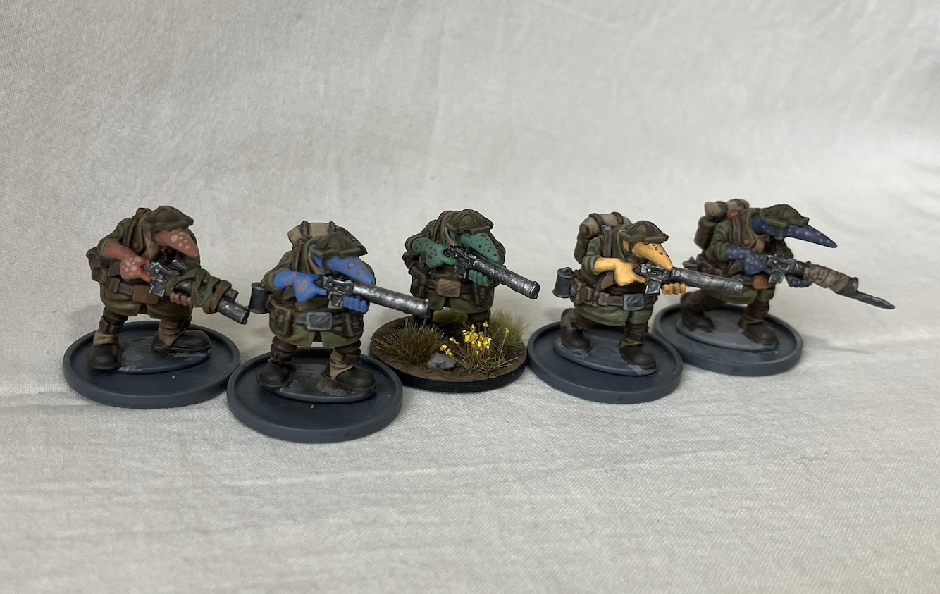 Wondering if I should push the inks further and more vibrant, since they are going to get a black oil wash and then silver drybrushing.