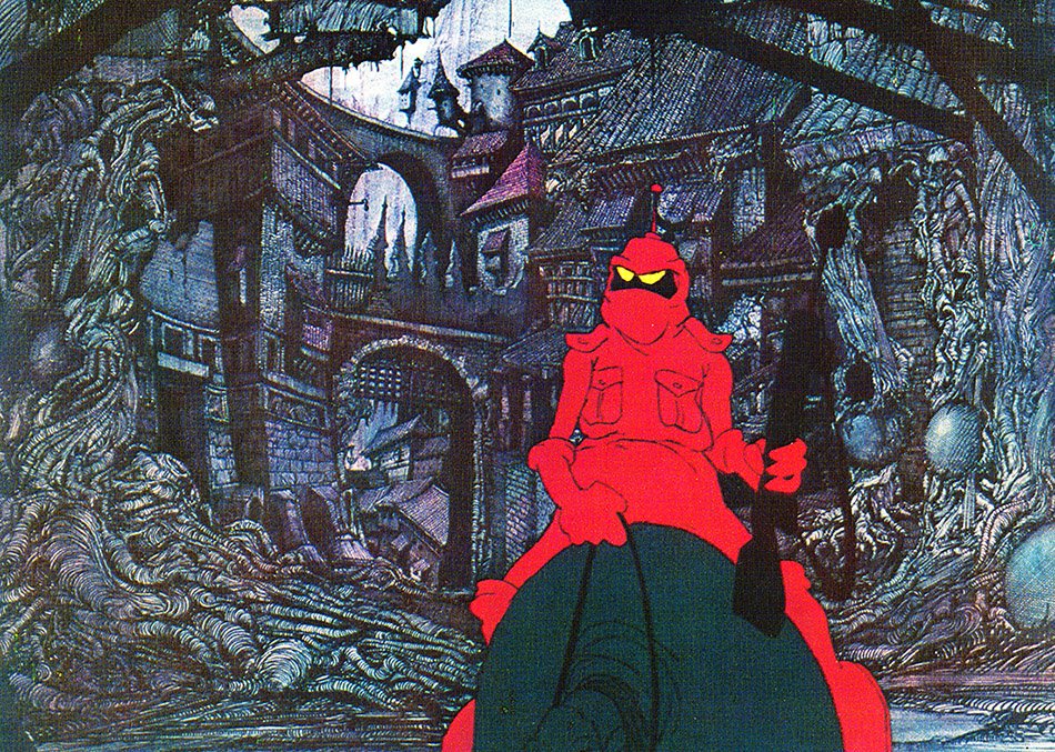 >>97452890Fantastic!Bakshi recruited Ian Miller to do backgrounds like the one seen here for Wizards - most specifically, the badlands of Skorch where Blackwolf rules. If you've been around since Rogue Trader, you'll find a lot of Miller's work in that book. He also painted the cover for the old Warhammer Siege book.